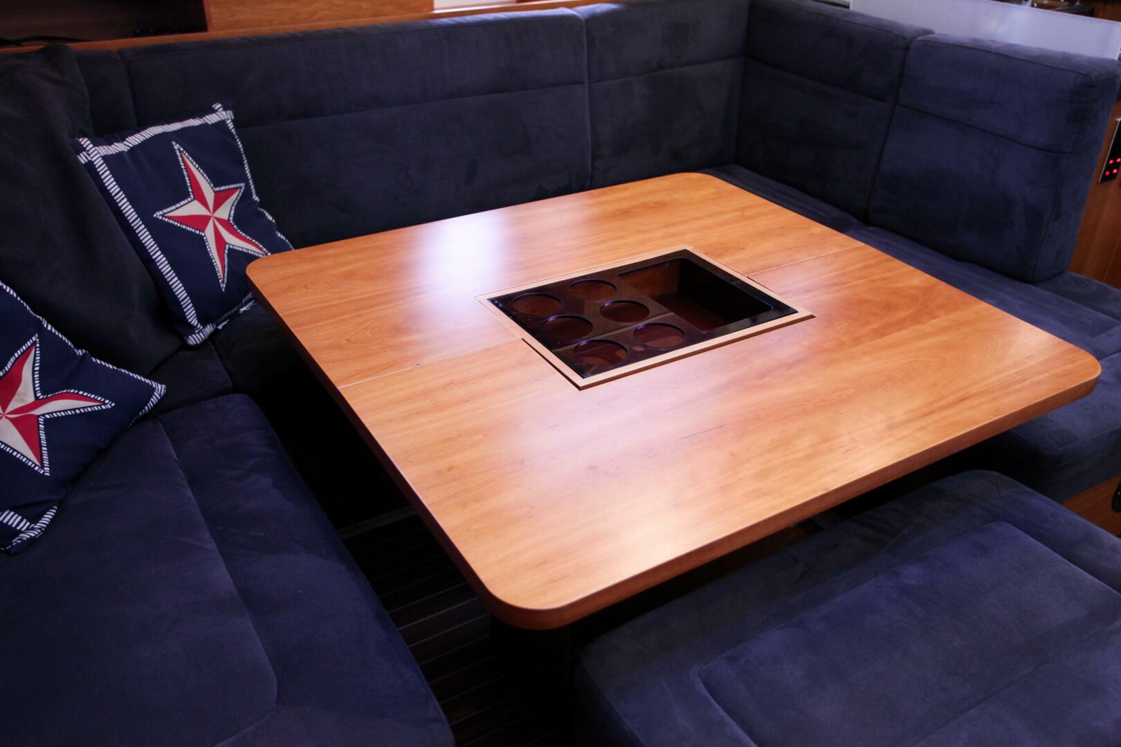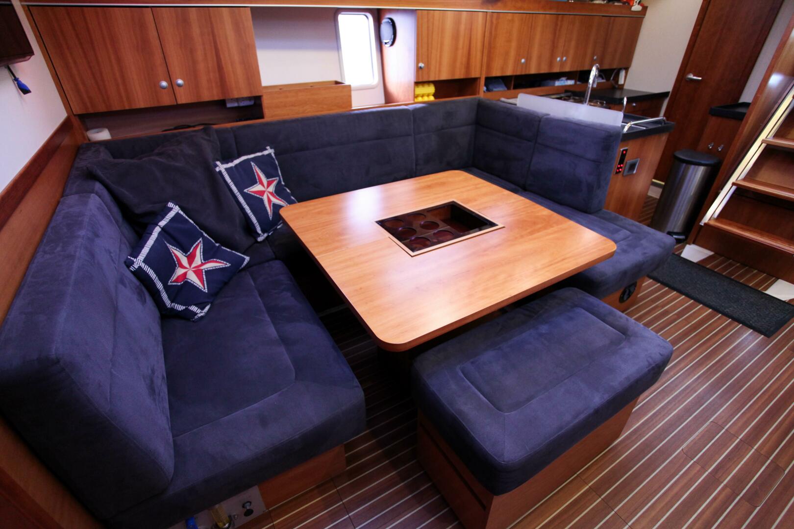 - U-shaped settee area with table on starboard
