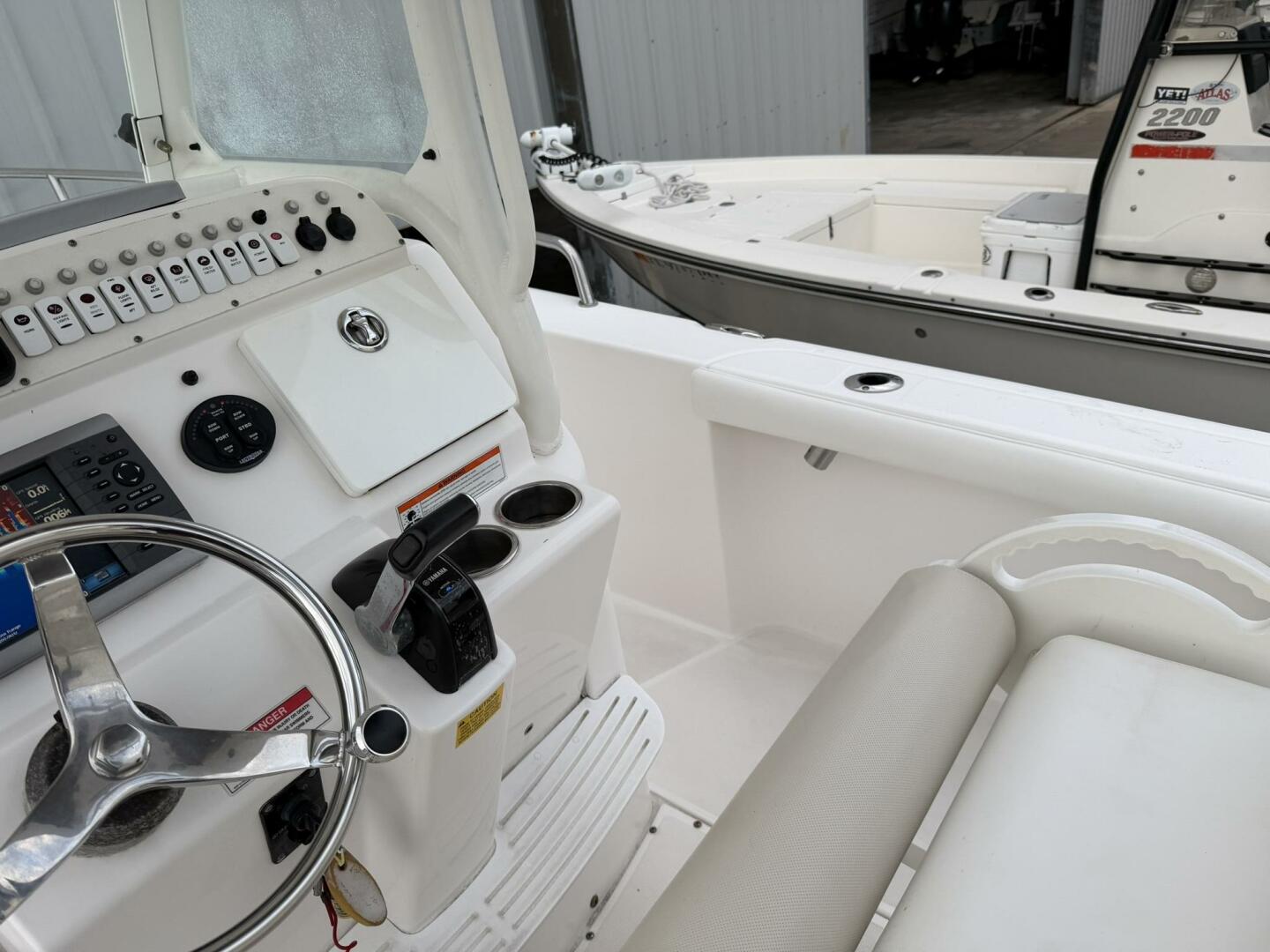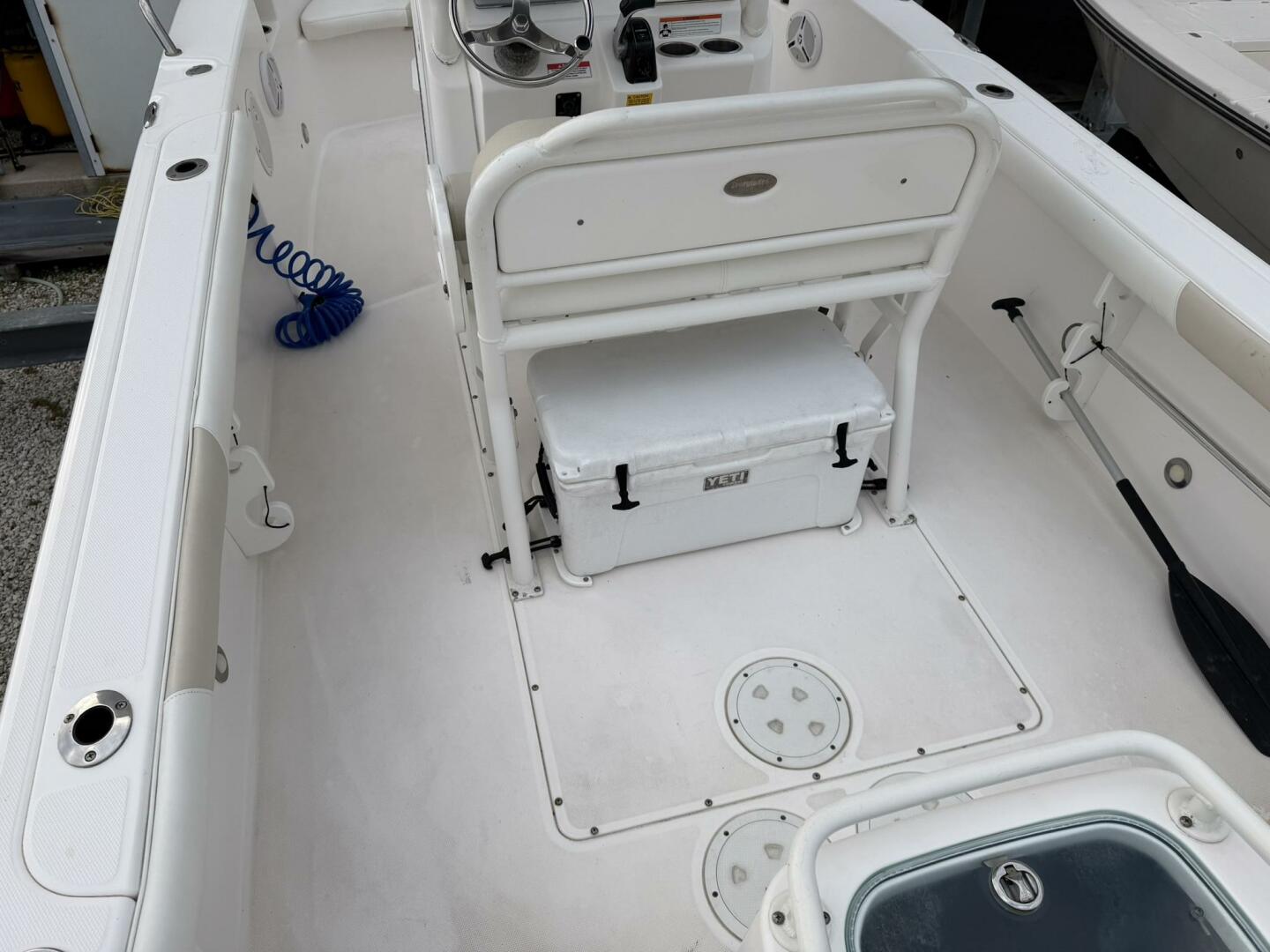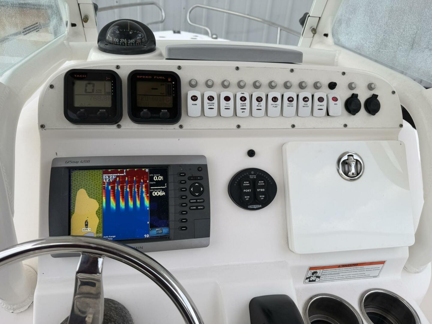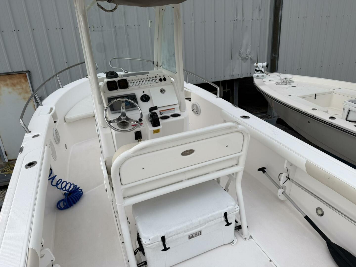 | Notable Upgrades: • Powder-coated hardtop with integrated speakers & lighting • Powder-coated mosquito/tow bar • Clarion stereo system with multiple speakers • Garmin 4208 GPSMap • West Marine VHF 580 • Electro-Tab trim tabs (Lenco / Electro-Tab) • Yamaha digital gauges (hours/engine data) • Porta-potty in large console compartment • Built-in livewell |