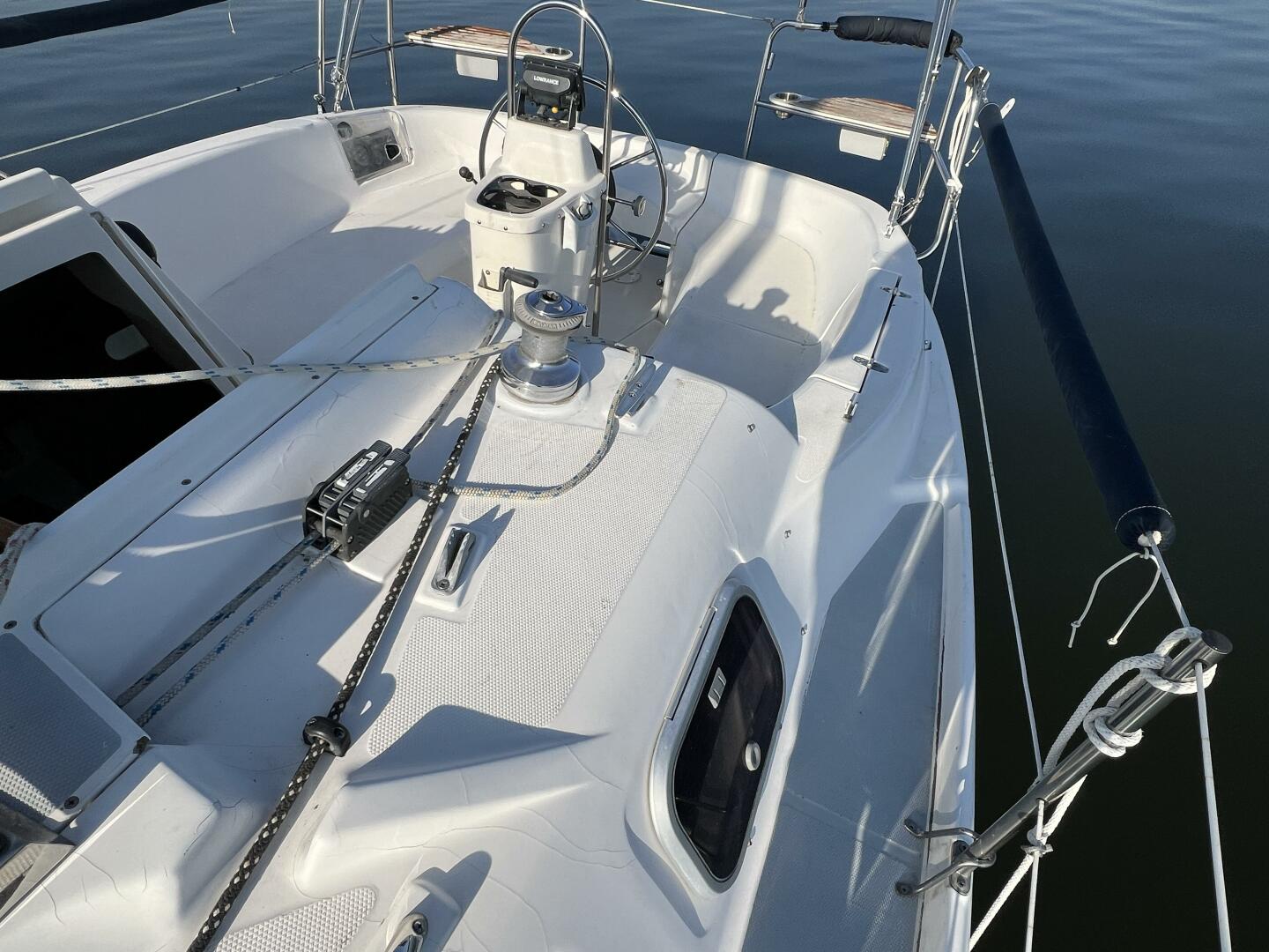 The cockpit is spacious and well laid out, offering comfortable seating and excellent visibility for the helm. Deck hardware is positioned for safe movement forward and easy sail handling.