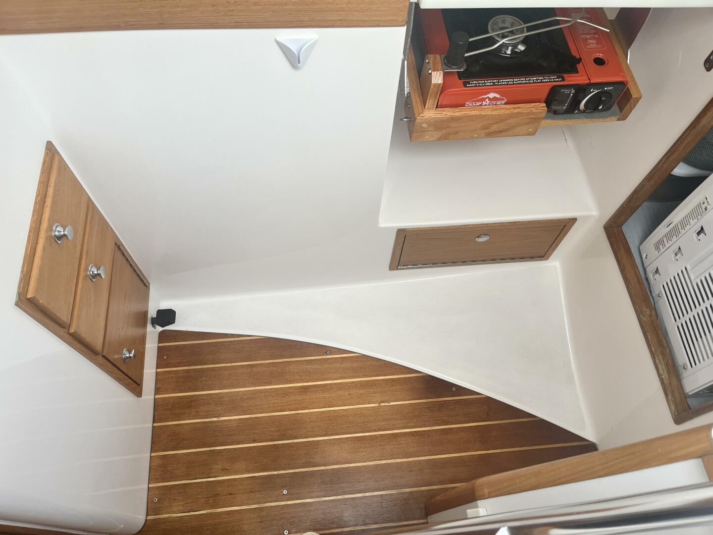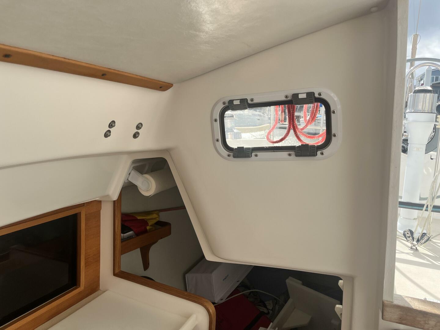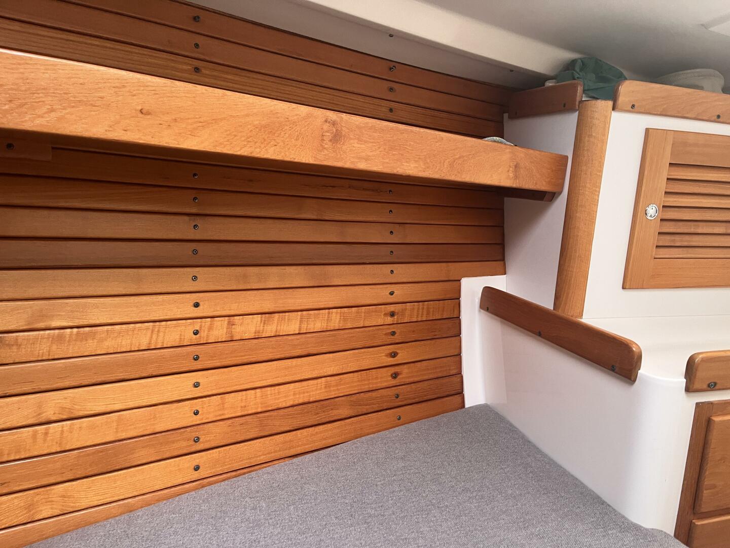 - Forepeak Teak Trim Package - Varnished teak ceilings in fwd cabin and full-length shelves