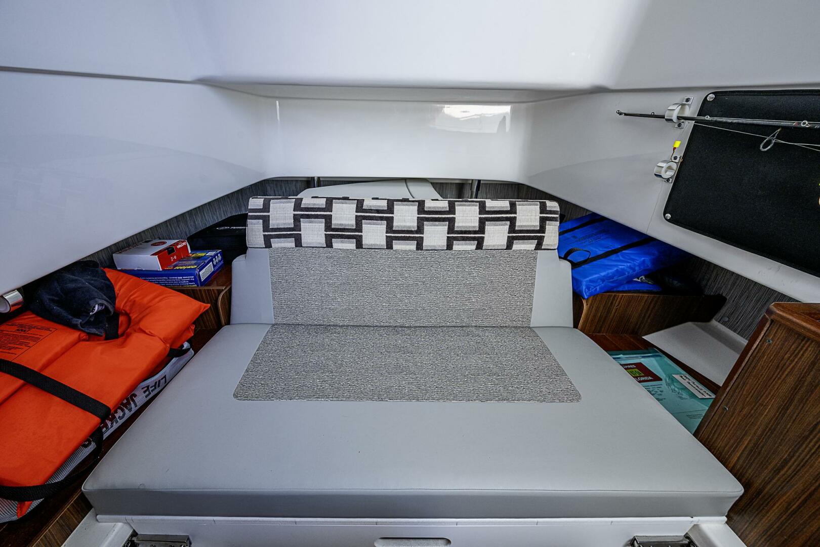 Below, a two-person berth converts to an aft facing seat with large open storage areas port and starboard. A head and sink with vanity could let you overnight and freshen up for a dinner shore side. The aft cockpit accommodates serious fishing and with the fold away fore and aft seats quickly converts to a social area at the dock.