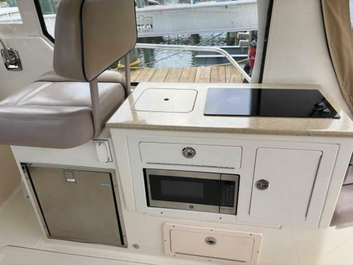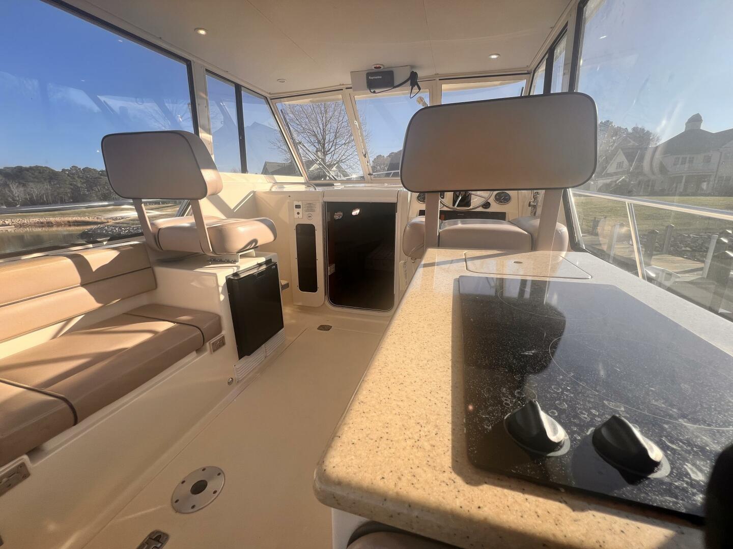 Large helm entertainment area seating eight with a starboard side galley including a two burner electric stovetop, sink with hot and cold water with dry storage beneath.