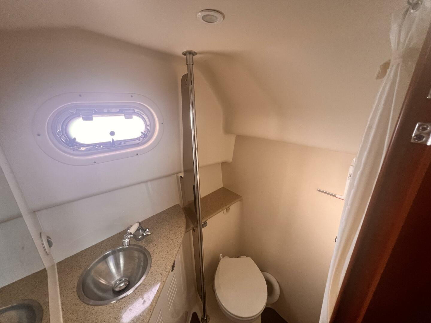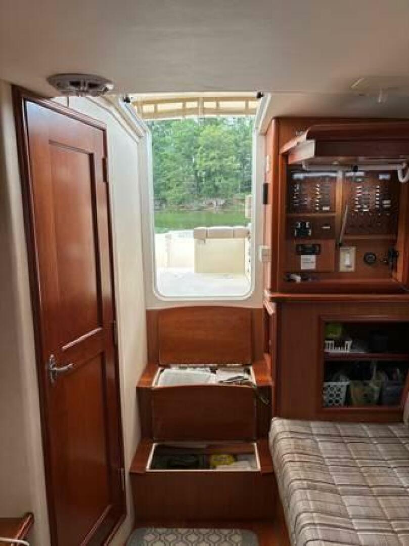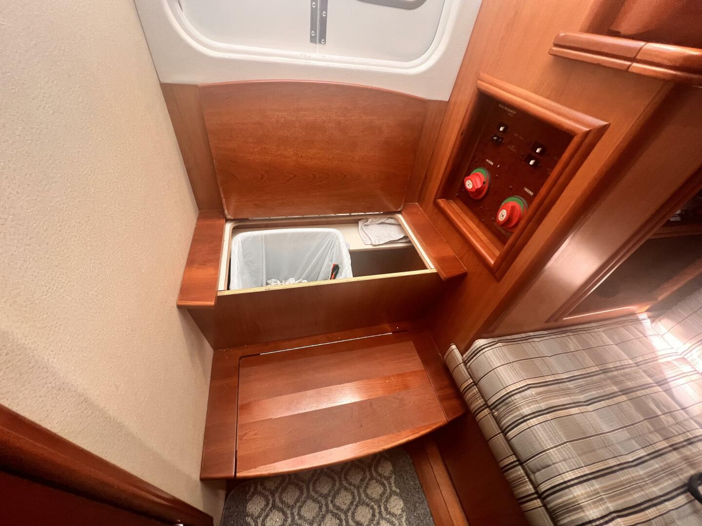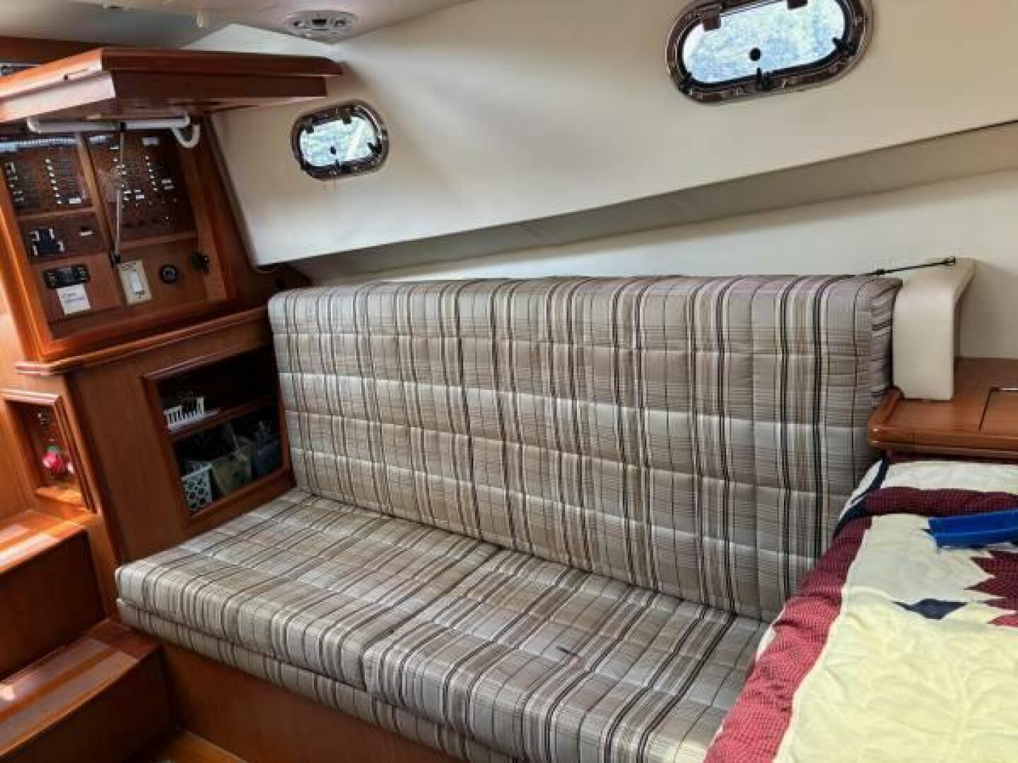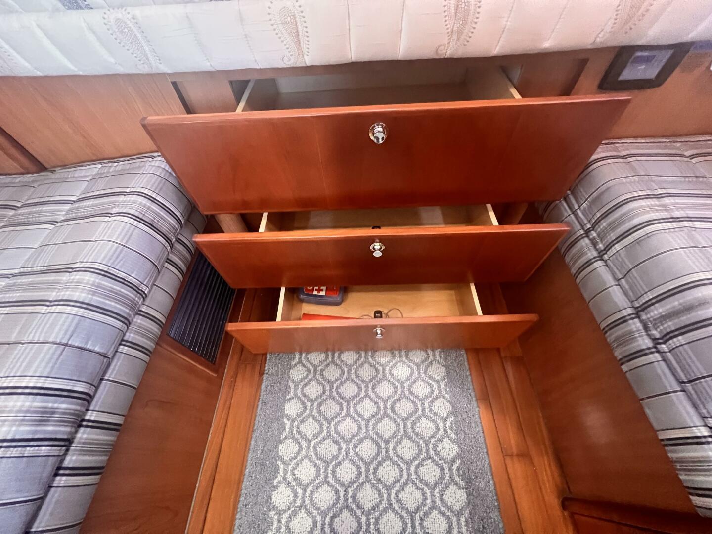Queen berth in forward cabin with a three seat settee that converts into bunk beds. A private head with pull out shower and quiet flush electric toilet is to port.