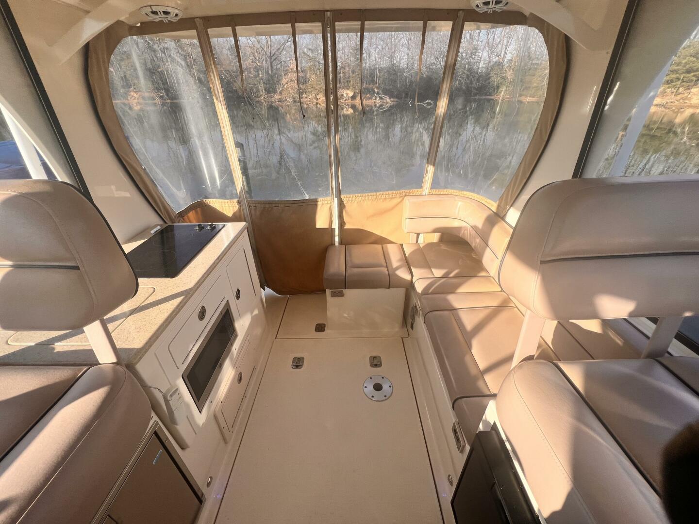 The cockpit features molded seating and storage lockers. The cockpit features a transom door for easy access to the swim platform enhancing its functionality for fishing and family outings.