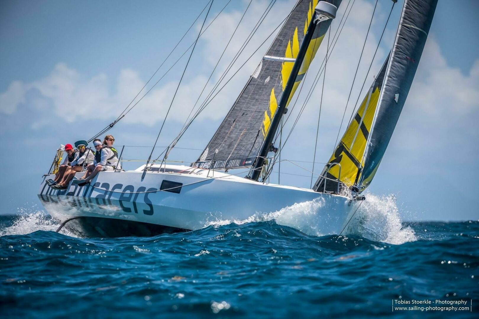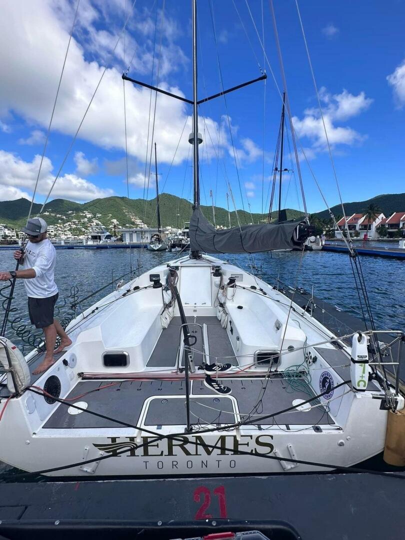 Notable deck equipment includes racing-grade running rigging, carbon mast with swept spreaders and square-top mainsail capability, multiple sail inventories for varied conditions, and offshore safety gear rigged for quick deployment. Ocean Racers operated this yacht as Hermes for race charter and offshore campaigns, participating in Caribbean events and training programs, reflecting her readiness for performance sailing.