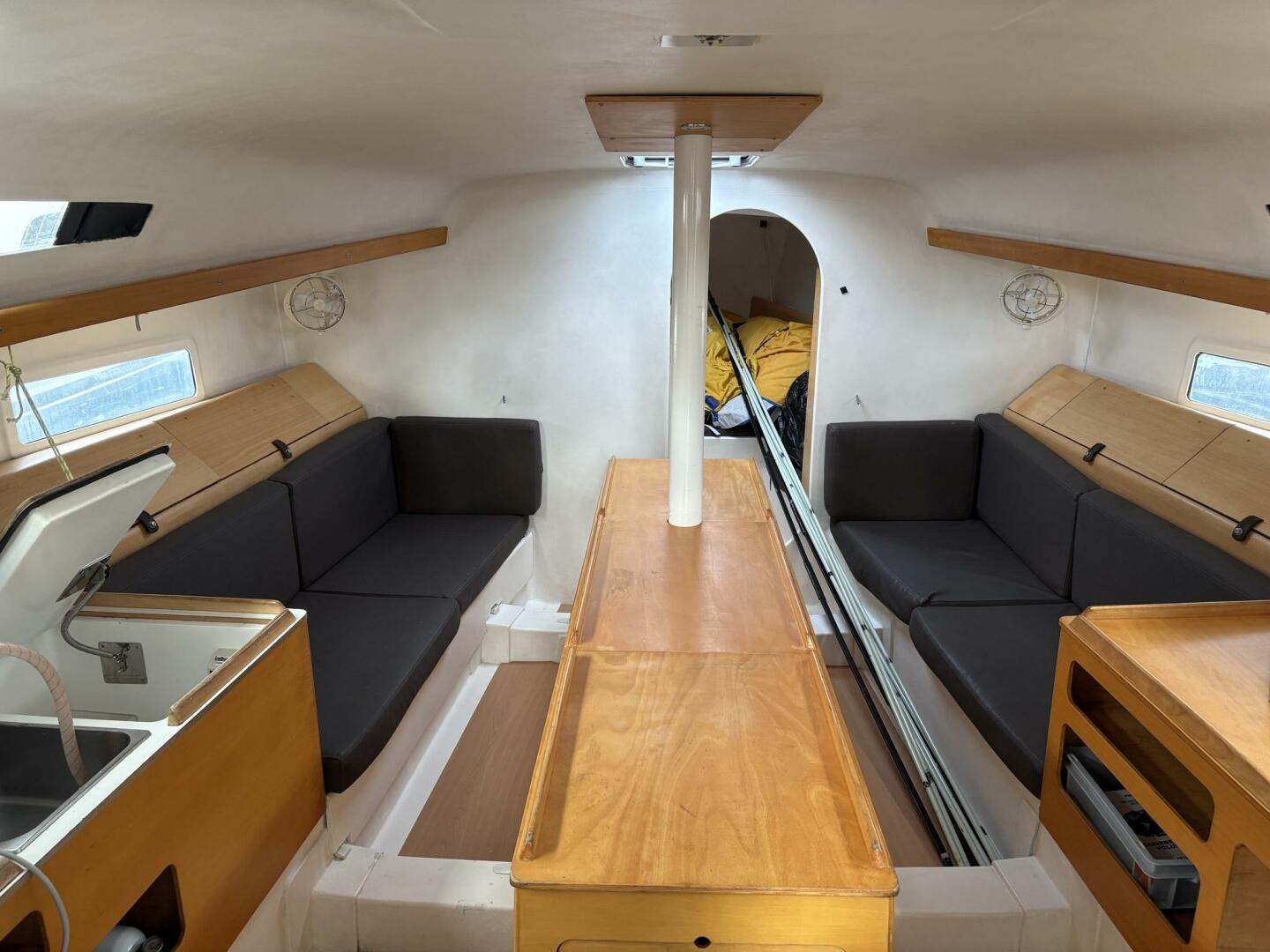 Below, the interior is functional and well-lit, optimized for offshore comfort and utility. A central saloon with sturdy table and comfortable settees provides communal space. The galley is equipped with secure storage, refrigeration, and provisions for extended cruising. Forward and aft cabins offer sleeping accommodations, with practical storage throughout. A dedicated technical/utility space and enclosed head with shower enhance liveaboard usability. Systems include pressurized water, navigation electronics, and integrated electrical distribution suitable for offshore voyaging.