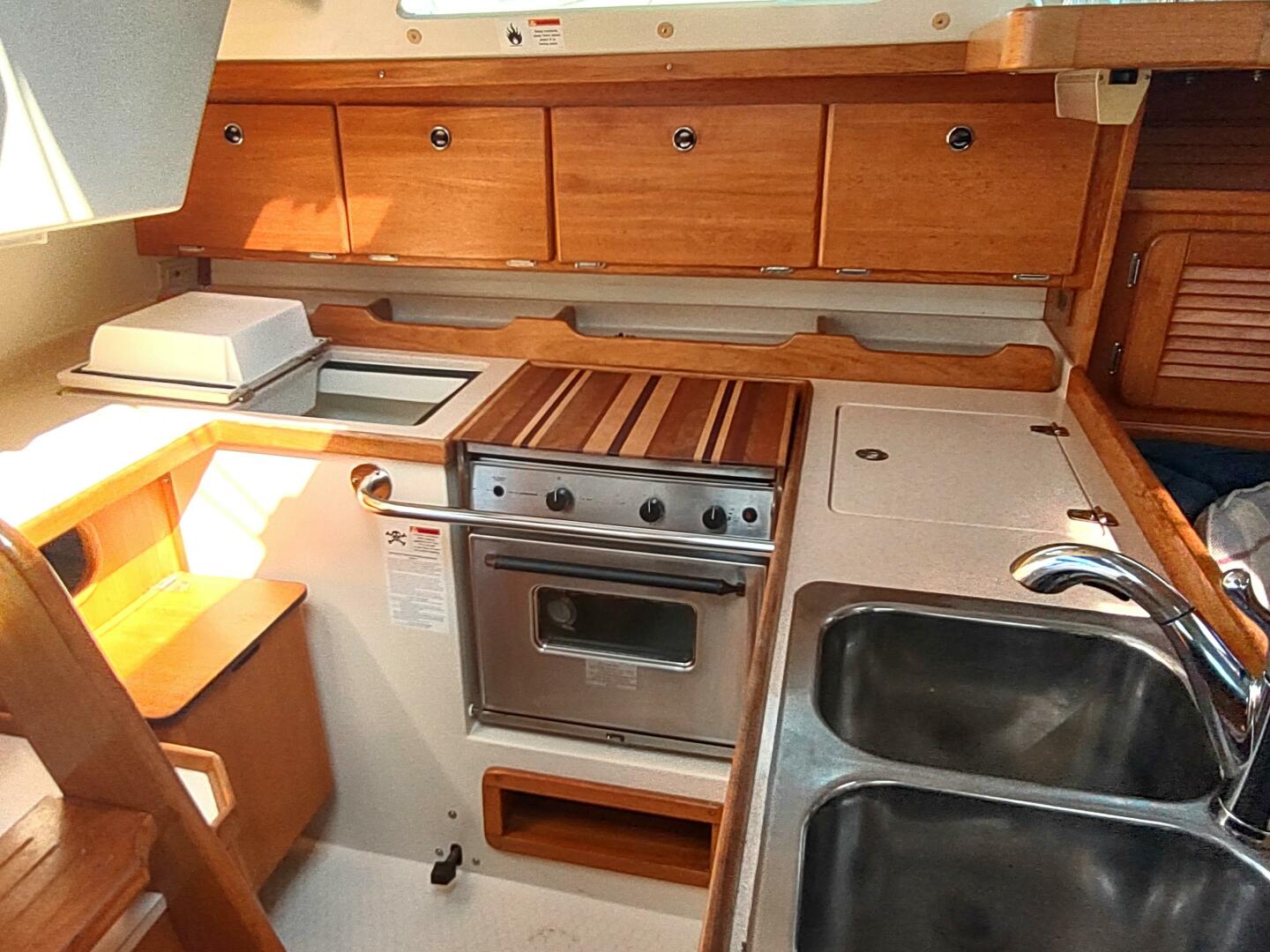 8) Two burner LPG stove & oven, DC refrigeration, H/C water