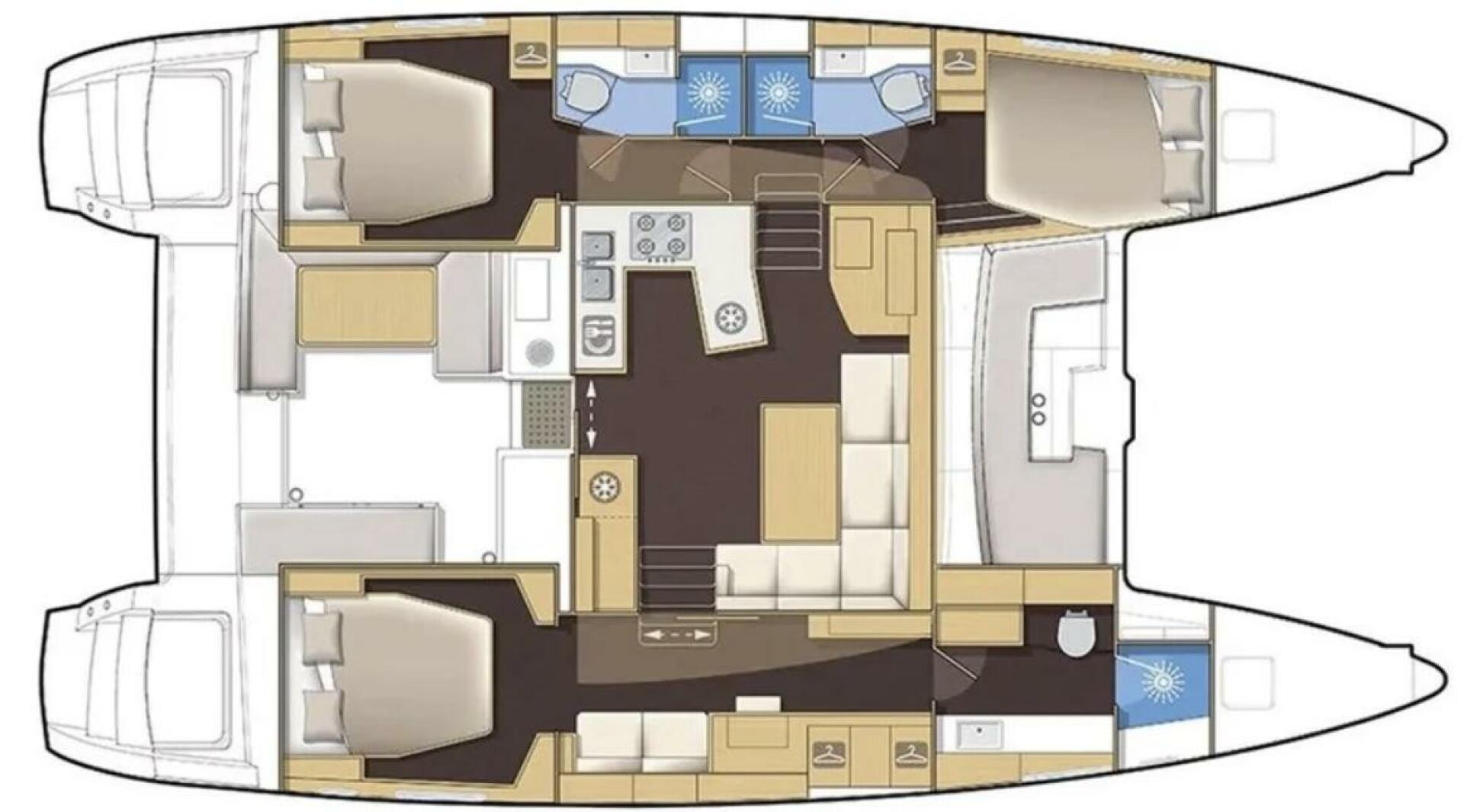 - Owners version (starboard hull) with queen-size semi-island berth (2.04 m / 6’7” x 1.60 m / 5’2” at widest point)