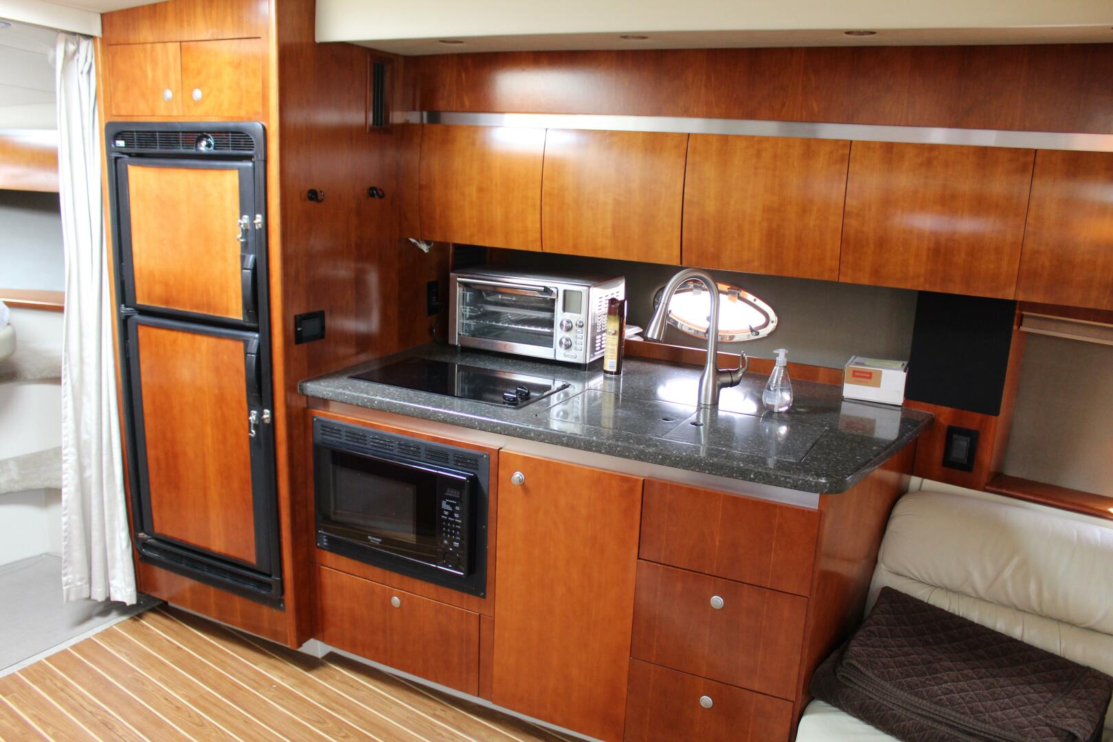 The galley is to starboard, featuring a large countertop with double sink, double cooktop and many cabinets above. A microwave/convection oven is below the countertop with more storage and drawers next to it. A large refrigerator/freezer is just forward of the counter.