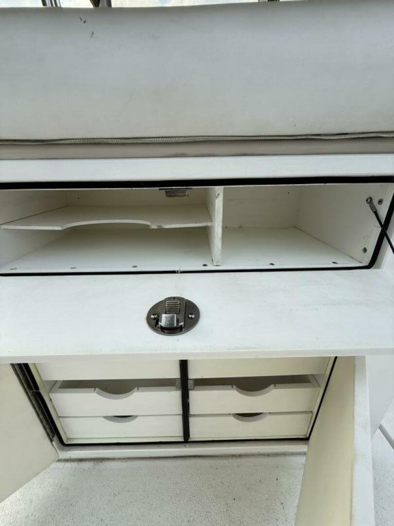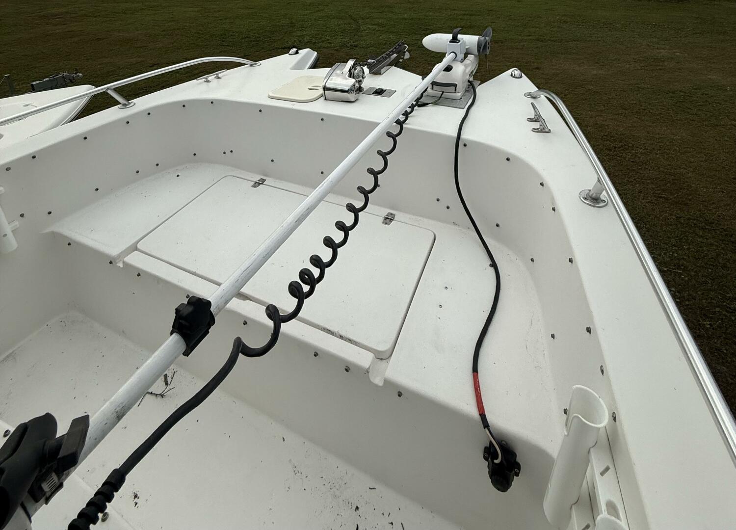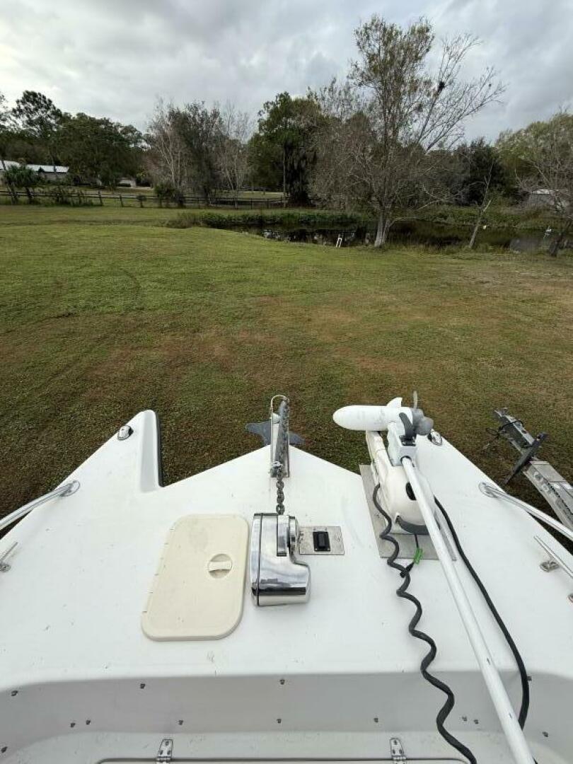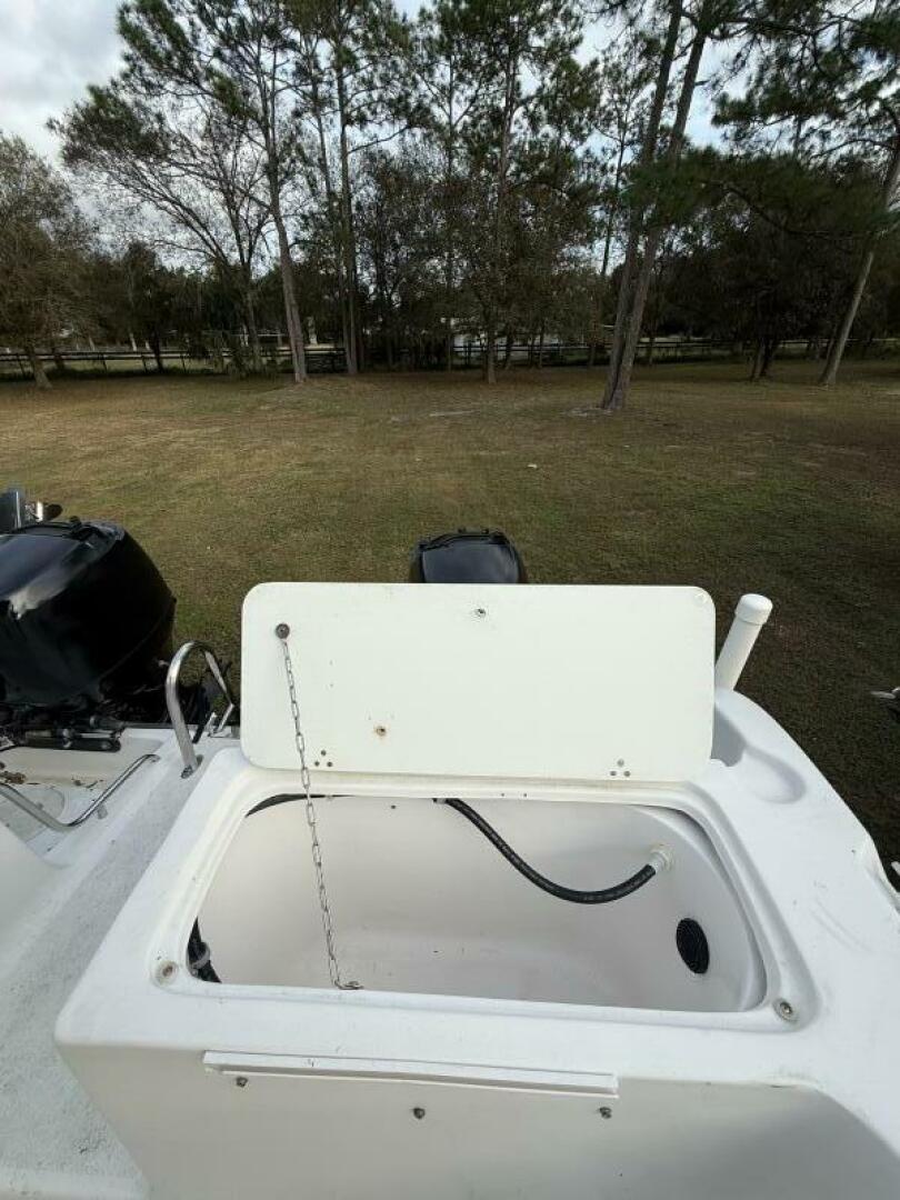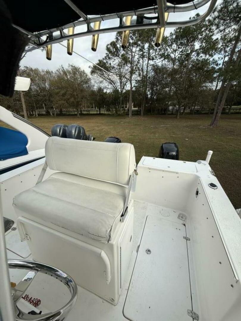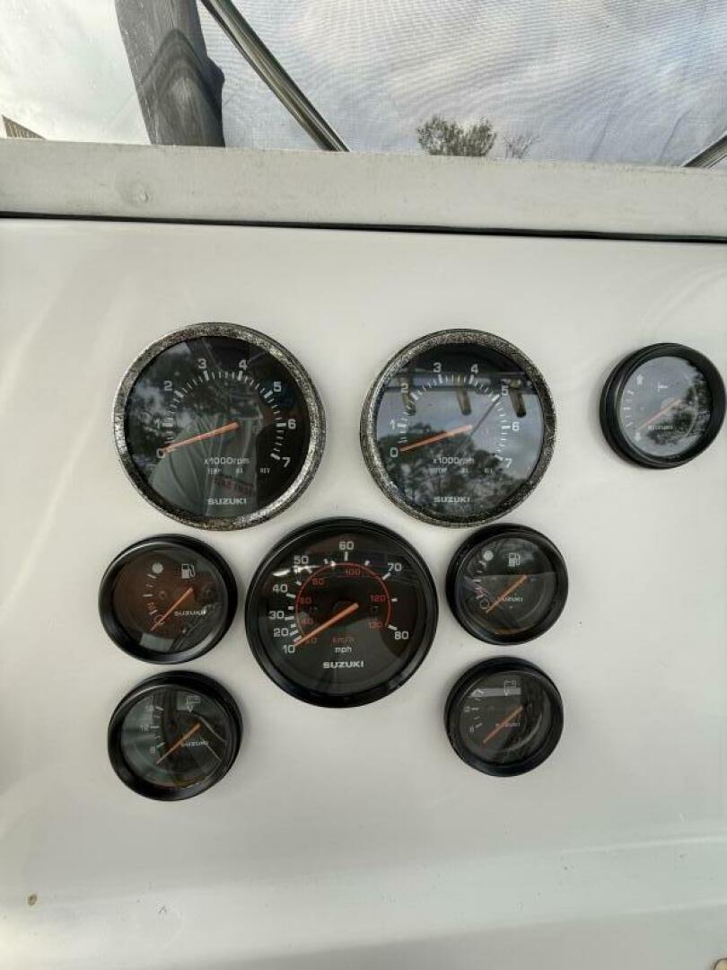 Up front, the large forward casting deck offers generous storage and is equipped with a Rhodan trolling motor, allowing you to stay locked on the fish with precision and control. At the helm, you’ll find Suzuki controls and gauges, a Garmin chartplotter, and a West Marine VHF, all powered by twin Suzuki 140 outboards for reliable performance and efficiency.