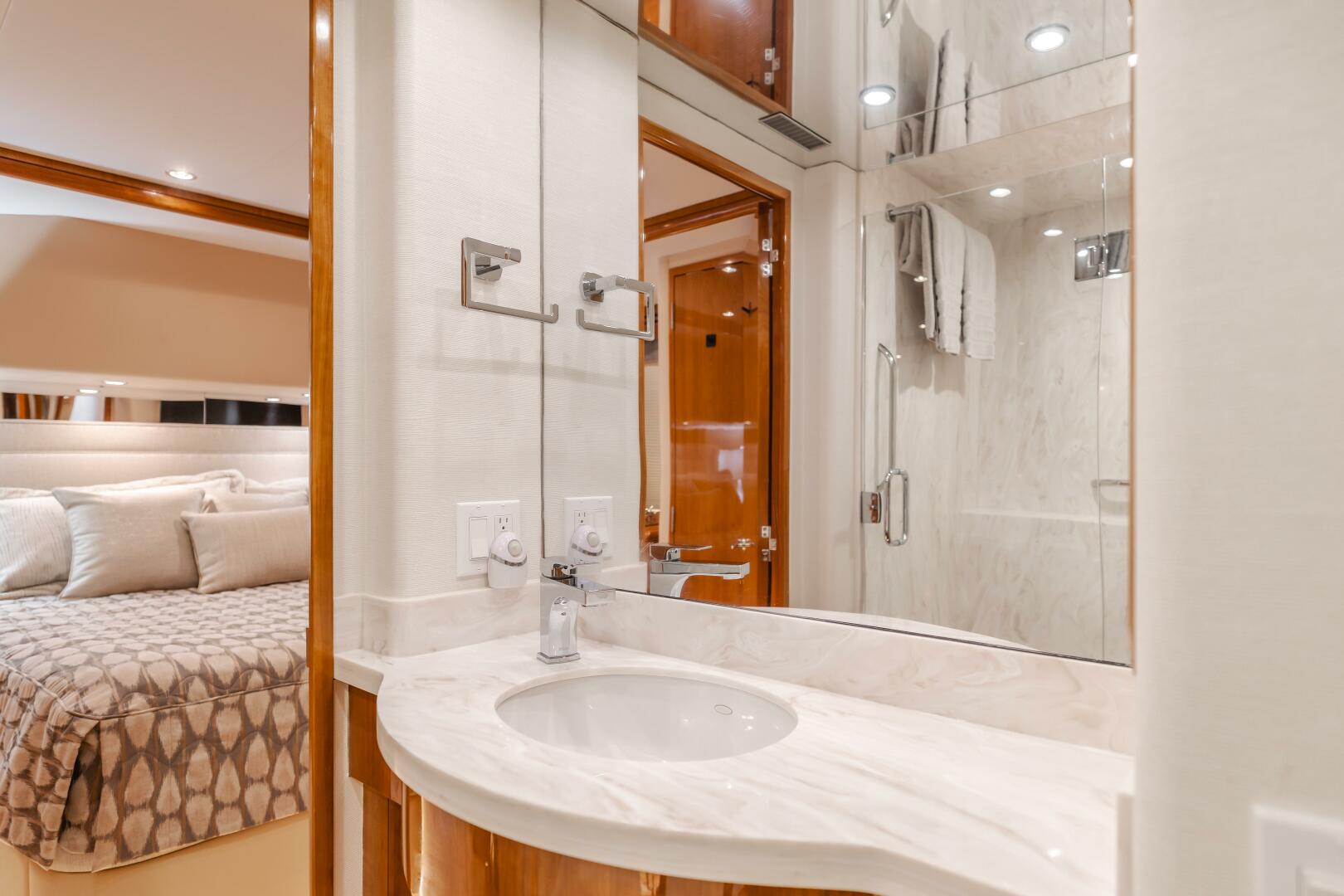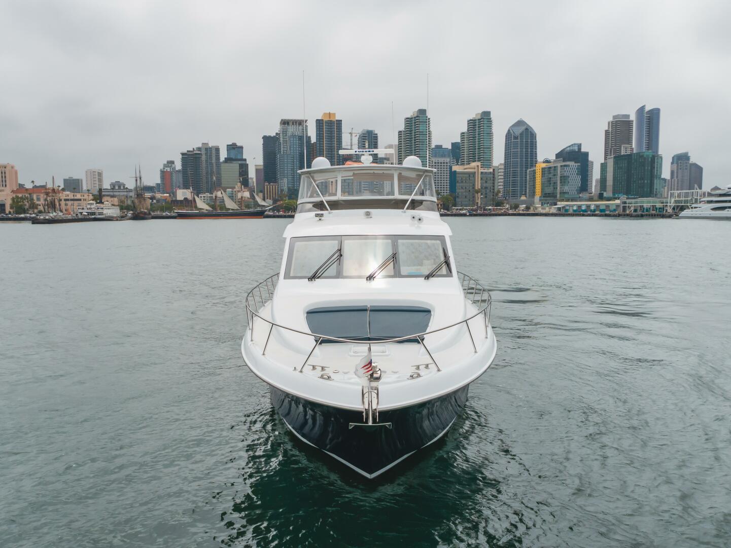 Swim platform with access to Aft Crew Quarters for two. Engine Room access from Crew Quarters. Aft Deck with hardtop overhang, access to swim platform, stairwell to Flybridge. Access to Main Salon with large “U” shaped sofa to stbd., TV to port and (2) Italian leather barrel chairs. Up 2 steps to stbd. side galley, “U” shaped dinette with table to port and stairwell to Flybridge/Boat Deck. Full Lower Helm on centerline, watertight door to side decks/foredeck. Access stairwell down to forward owner / guest cabins. Full beam Master Stateroom with king berth and ensuite head with new quartz walk-in shower enclosure. Forward to port is the guest stateroom with side-by-side twin berths & ensuite head. Guest foyer with stack washer/dryer. Forward bow VIP Guest Stateroom with centerline queen berth and ensuite Head. Exterior walkaround decks foredeck with recessed sun pad. Flybridge accessed from Aft Deck and Pilothouse/Galley. Flybridge with custom hardtop and 4-sided enclosure, centerline helm with 2 pedestal chairs, and real teak flooring. Portside “L” settee with New teak dining table, starboard wet bar with storage below, sink and under-counter refrigerator with ice maker.