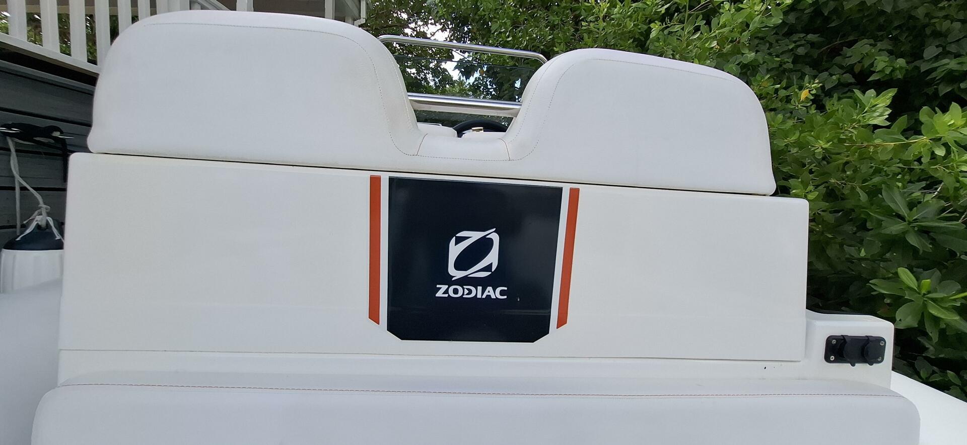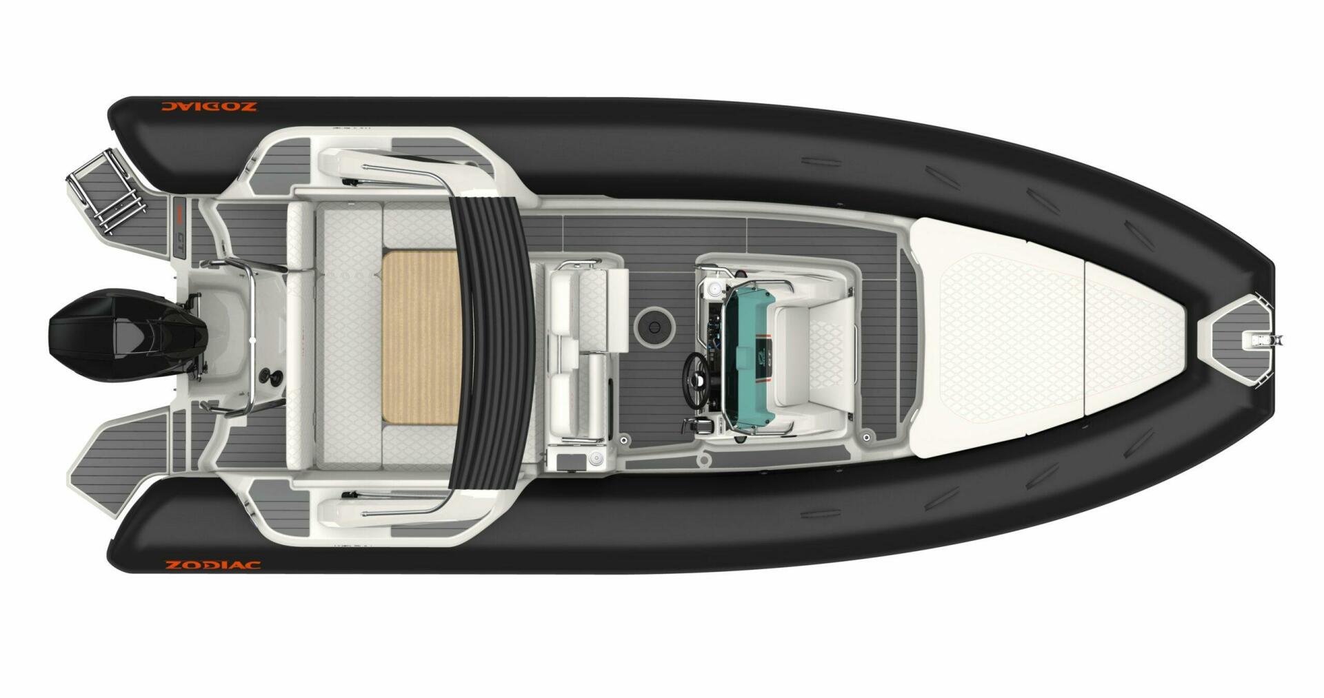 Zodiac’s designers have clearly put a lot of thought into the features and layout of this RIB. With Zodiac’s patented sliding system, the Hypalon tubes can be replaced in a matter of hours and do not require professional installation. The tubes feature an outer textured material that provides excellent non-skid while remaining comfortable on the skin. The retractable bimini allows the boat to reach full speed with minimal windage when stowed and offers great shade when deployed. The offset swim platform with ladder allows swimmers to reboard safely without getting too close to the engine. A removable table in the aft seating area can also be converted into a sunbed. The entire console is hinged, providing easy access to the hull.