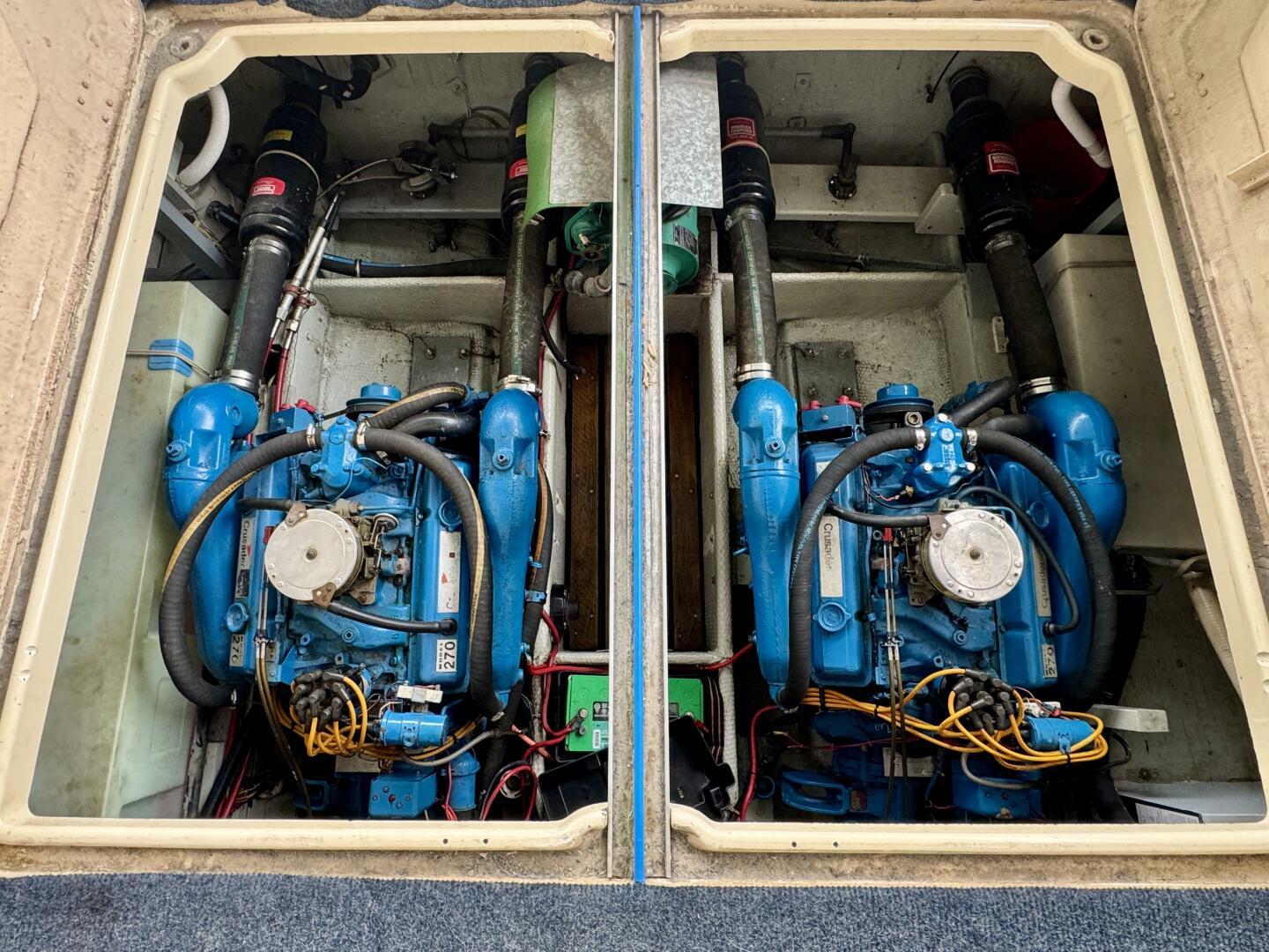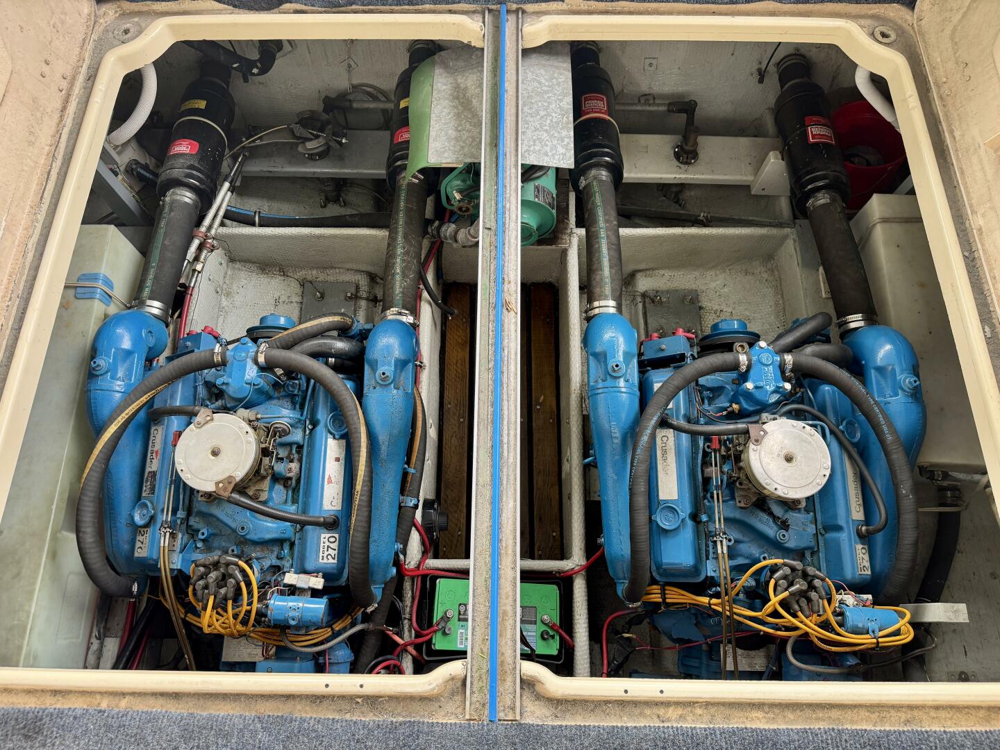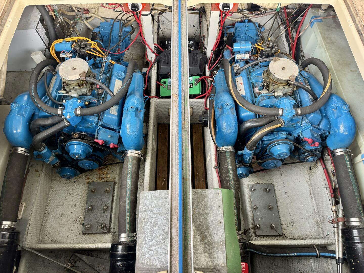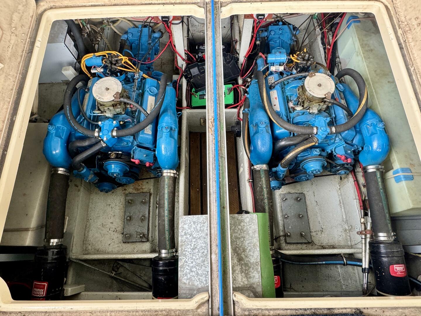 Twin Crusader 350ci 270HP V-8 Inboard V-Drive Engines (2,153 Hours), Warner 1:1 Velvet Drive Transmissions,