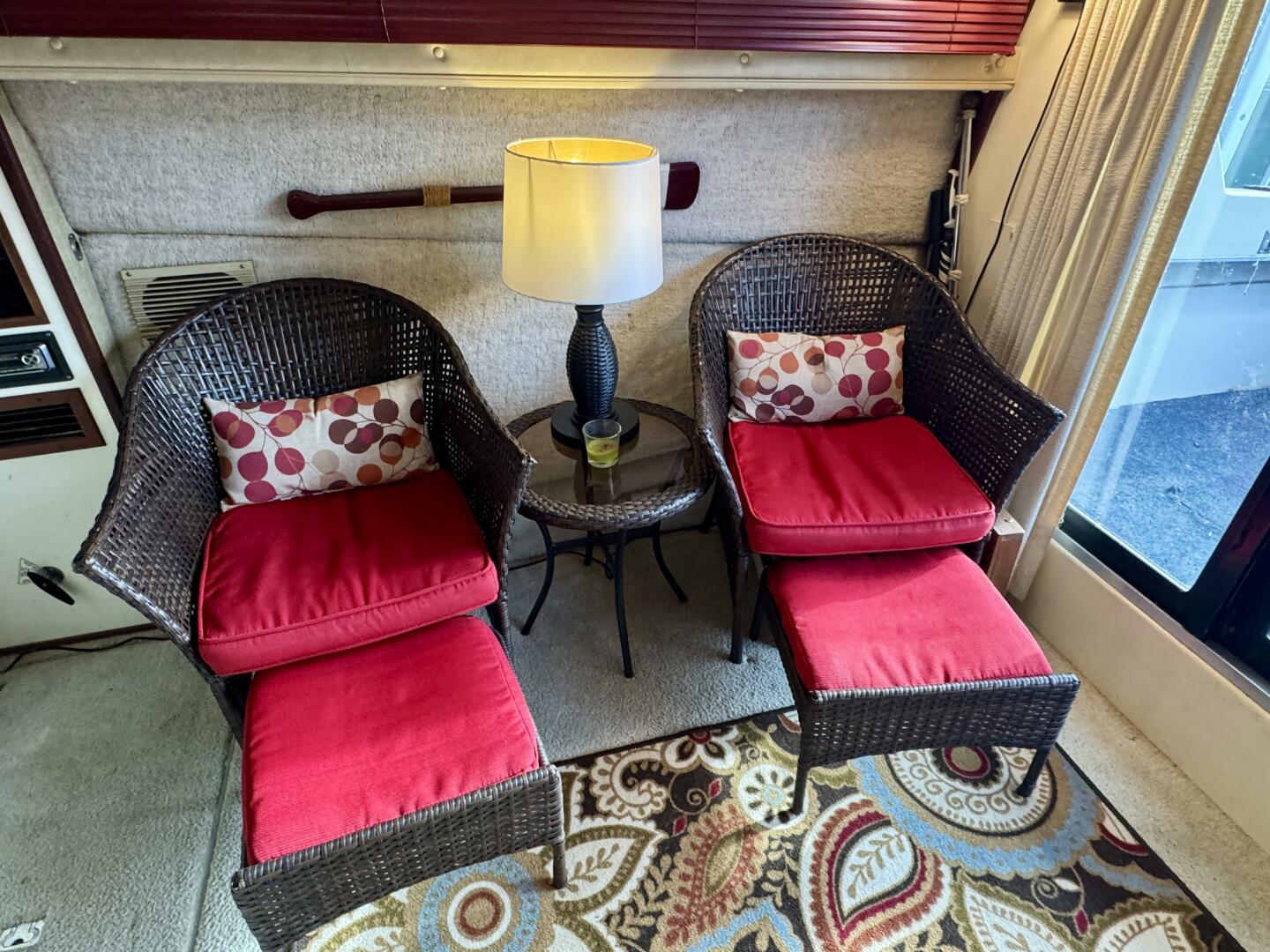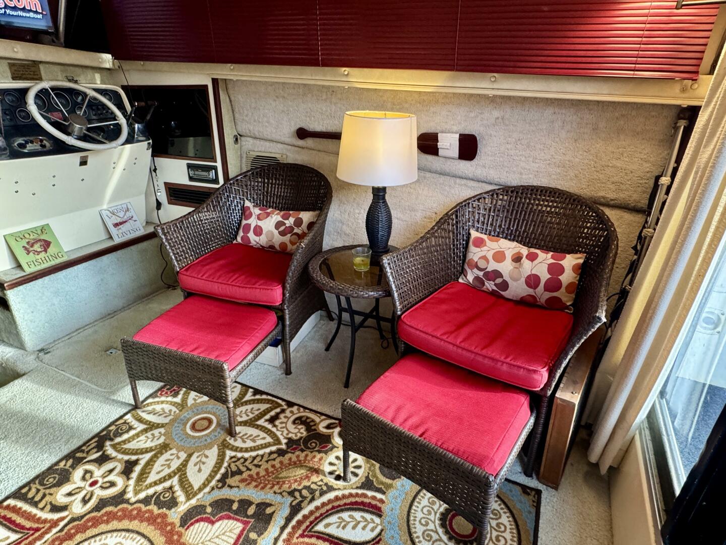 Returning to the cockpit you can enter the cabin easily through the sliding door where you'll find a convertible sofa to the port and a pair of wicker deck chairs to starboard and the lower helm just forward on the starboard side. The stereo is mounted at the lower helm along with controls for the 16K BTU marine air conditioning unit with reverse cycle heat.