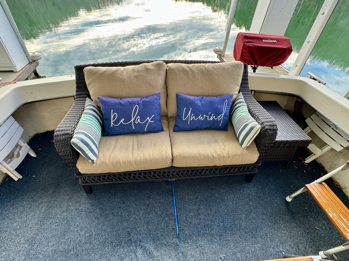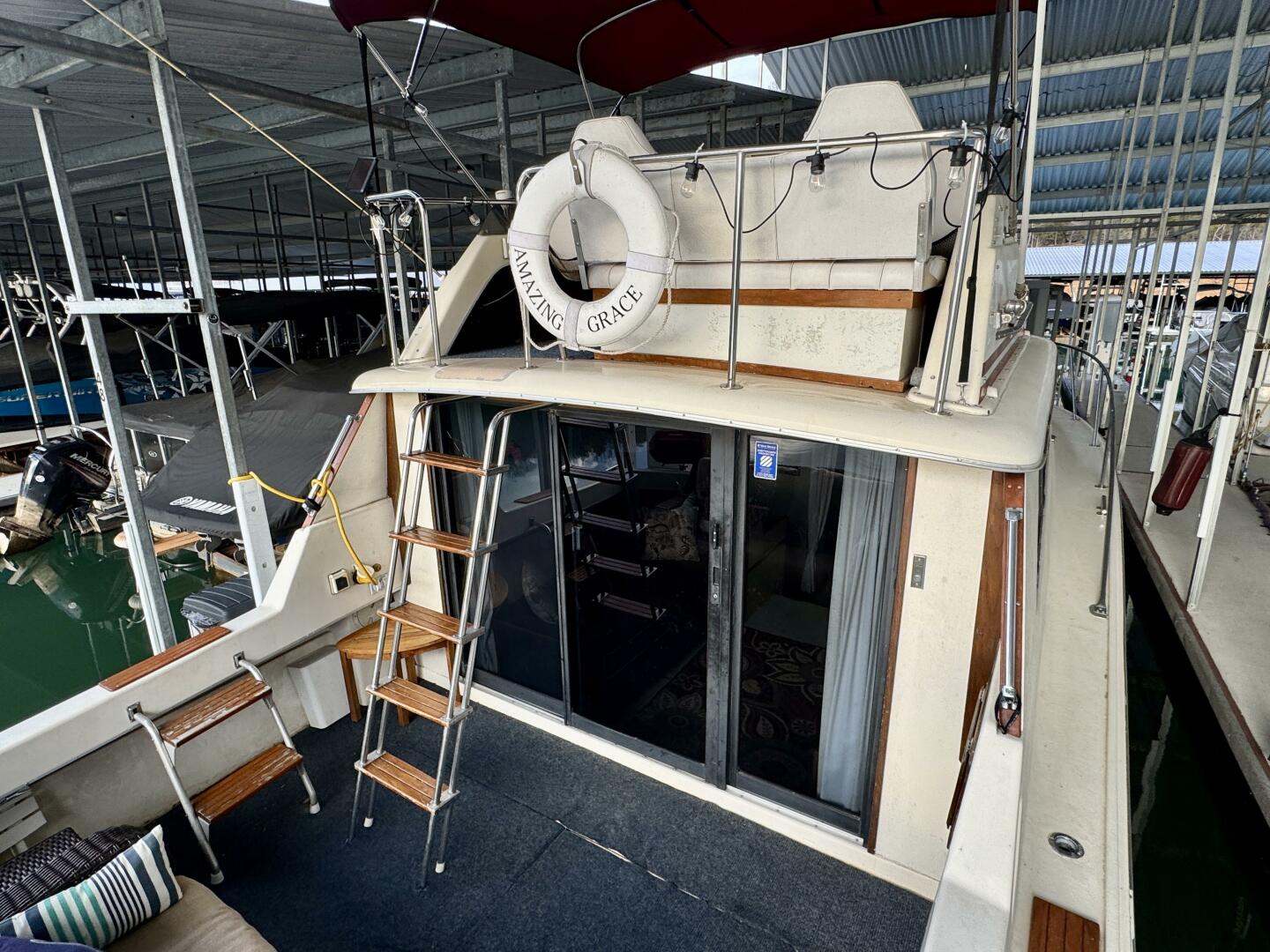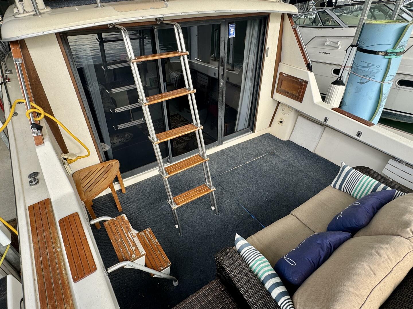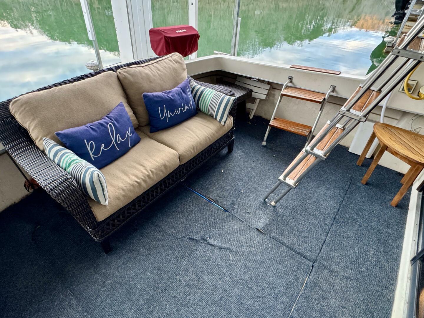Entering from the cockpit you'll find an inviting patio loveseat to the stern that sits above the engine hatches housing the twin Crusader 350 inboard engines with warner velvet drive transmissions, an onboard battery charger, electric water heater, the fresh water and waste holding tanks, and more. At the transom you'll also find a rod-holder mounted Magma gas grill that's occupying one of two integrated rod holders and the integrated swim platform just beyond it with a 2-step swim boarding ladder.