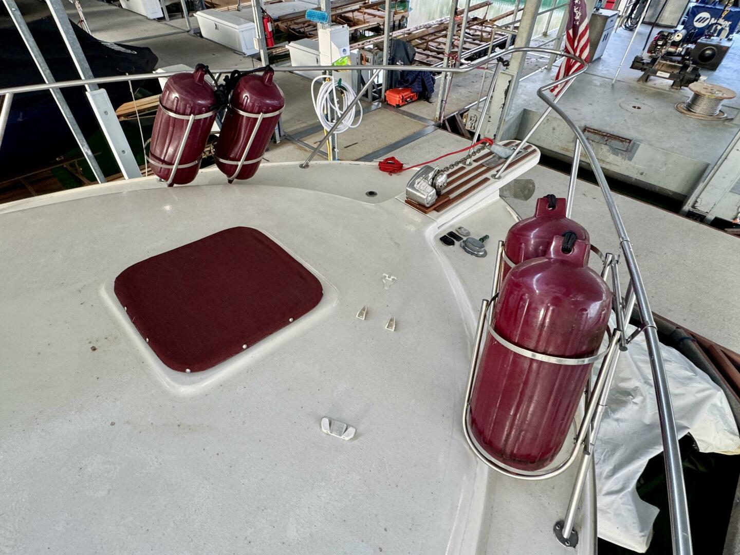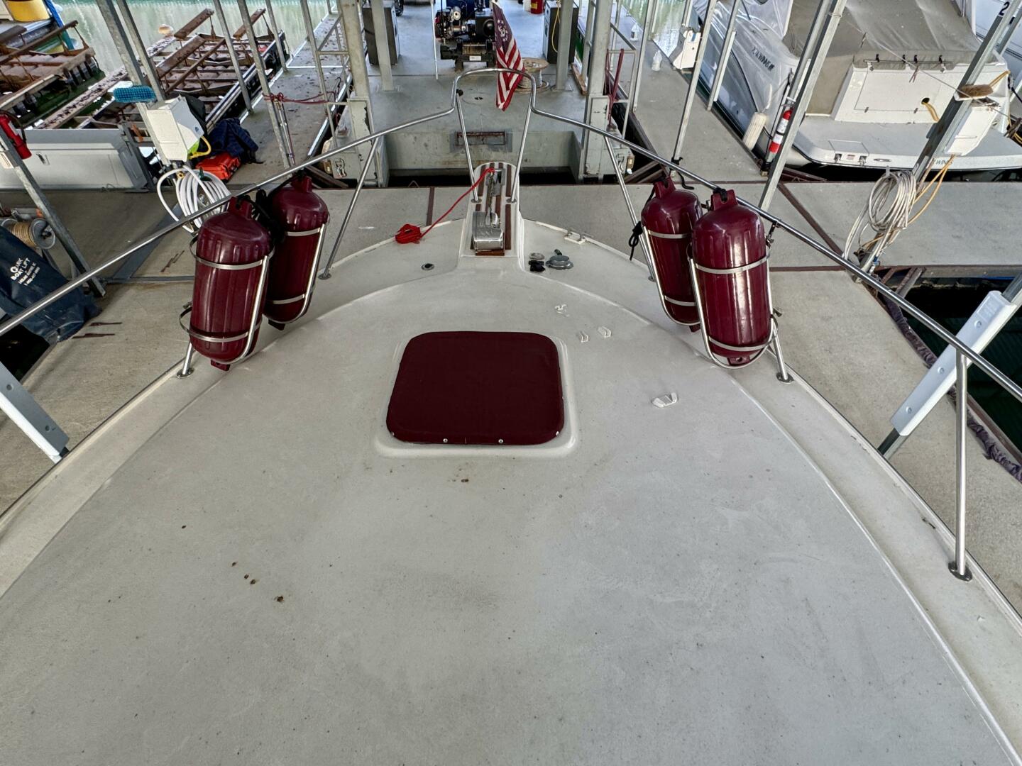 Looking towards the bow from the cockpit you've got a removable ladder for accessing the flybridge that's equipped with a bimini top, sitting and cupholders for 6, a hailer with an intercom to the cabin below, and more. You've got handrails integrated into the exterior sides of the flybridge for accessing the bow area where you'll find a lewmar windlass anchor, an integrated washdown in the anchor locker, and 4 fender holders with fenders.