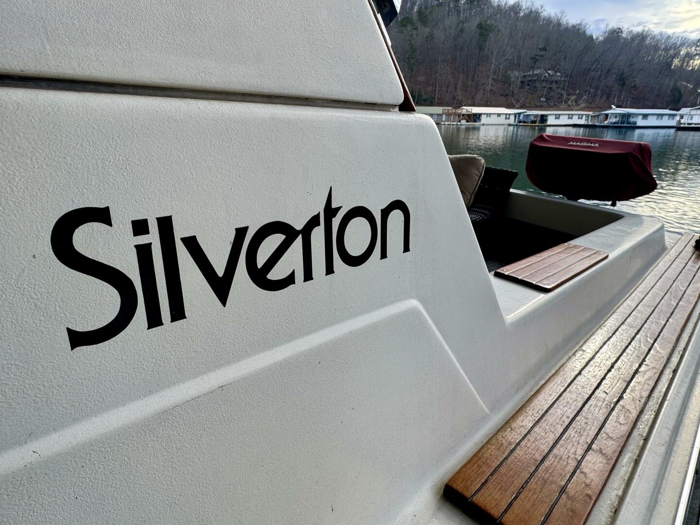 This Fresh Water 1979 Silverton 34 Convertible For Sale on Norris Lake Tennessee is equipped with twin Crusader 350ci V8 270HP inboard V-drive engines and features sleeping berths for 5-6 in a V-berth, convertible bunk/settee, and a Serta full-size convertible reclining sofa, plus an electric wet head with sink/shower, a galley with an AC/DC fridge, electric range, microwave, coffee maker, double stainless sink, and a magma gas grill mounted at the transom. Comfort is provided by a newer marine air conditioning unit with reverse cycle heat (16K/17K cooling/heating BTUs). Other notable features include upper and lower helm controls with a flybridge, a lewmar windlass anchor, hydraulic trim tabs, an AM/FM/CD stereo with cabin and flybridge speakers, VHF radio, hailer/intercom, onboard battery charger, halon fire suppression system, and more. The Norris Lake covered slip is transferable.