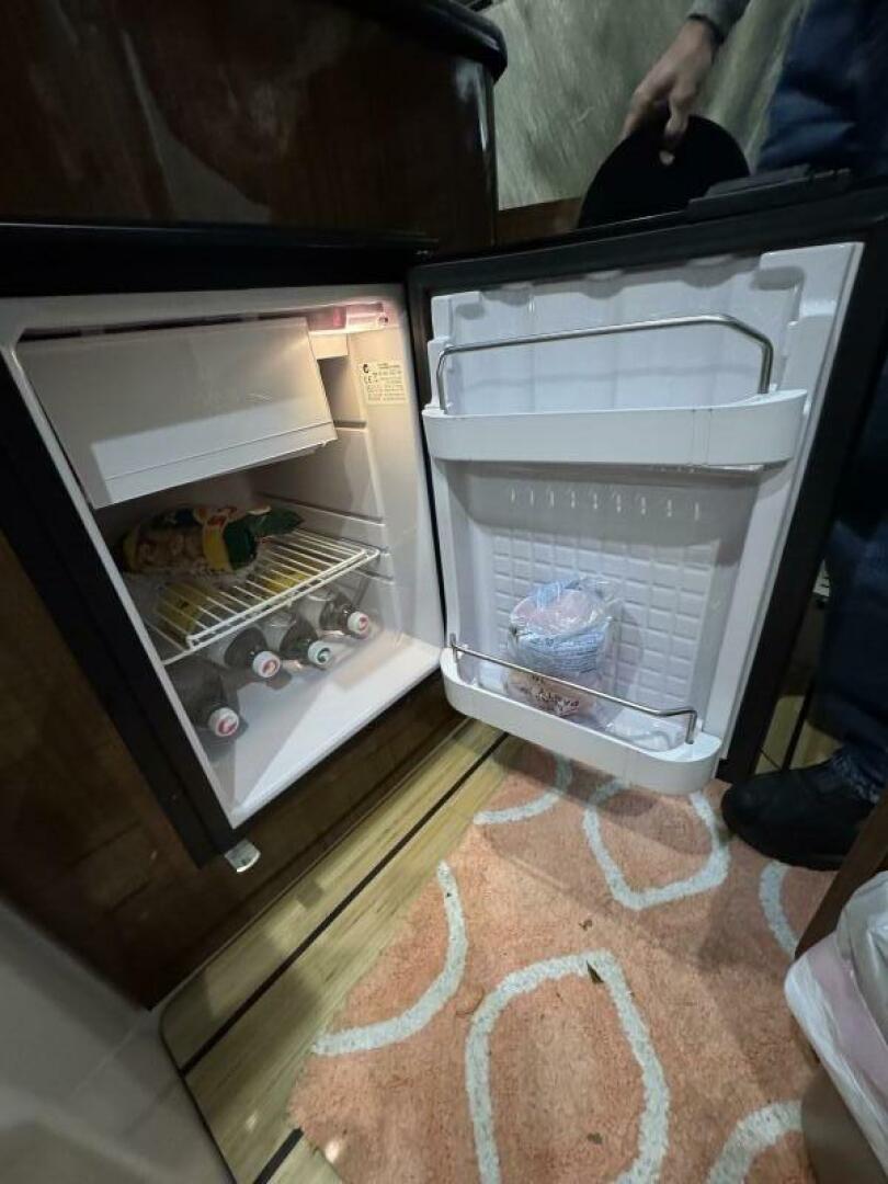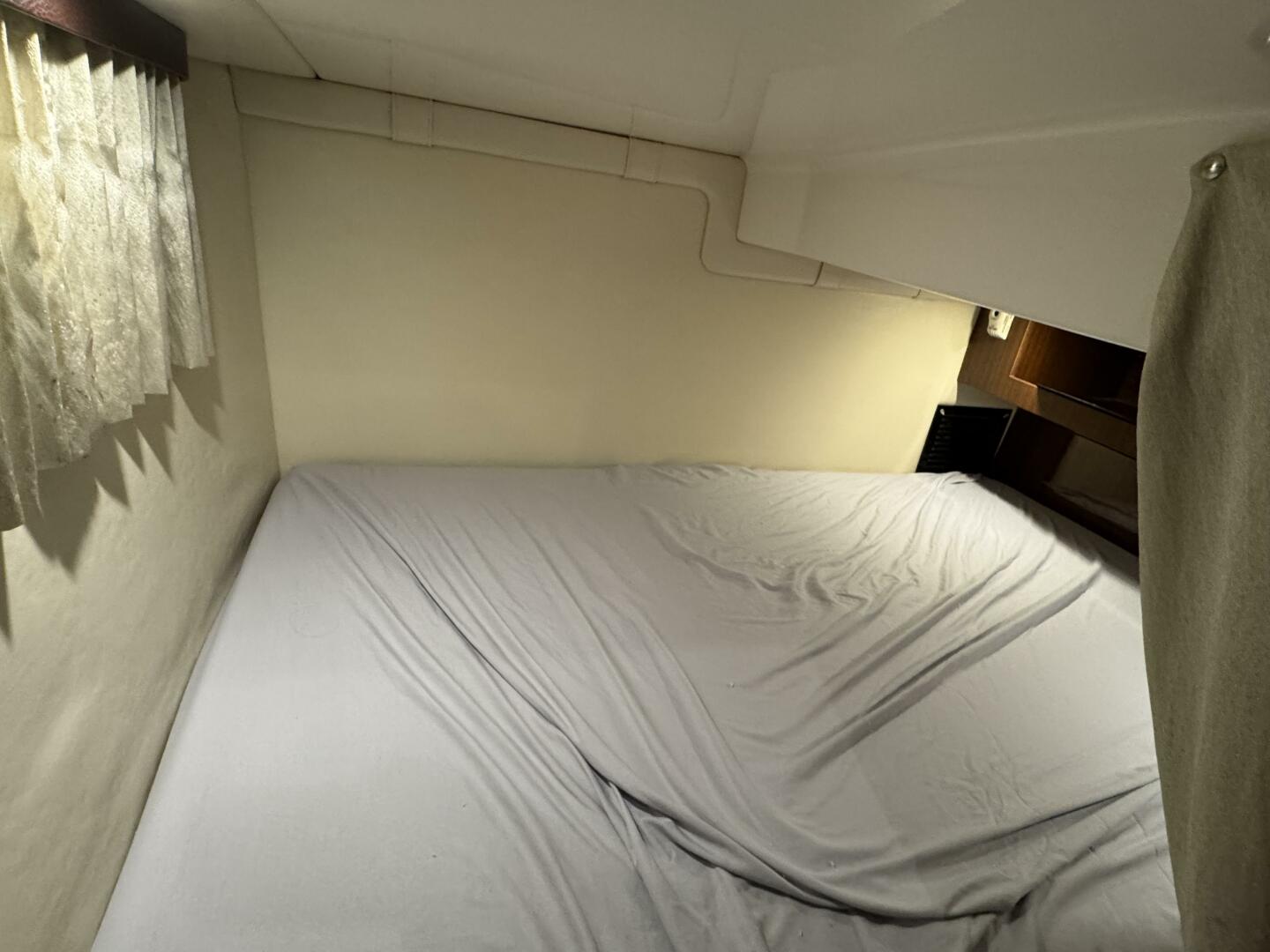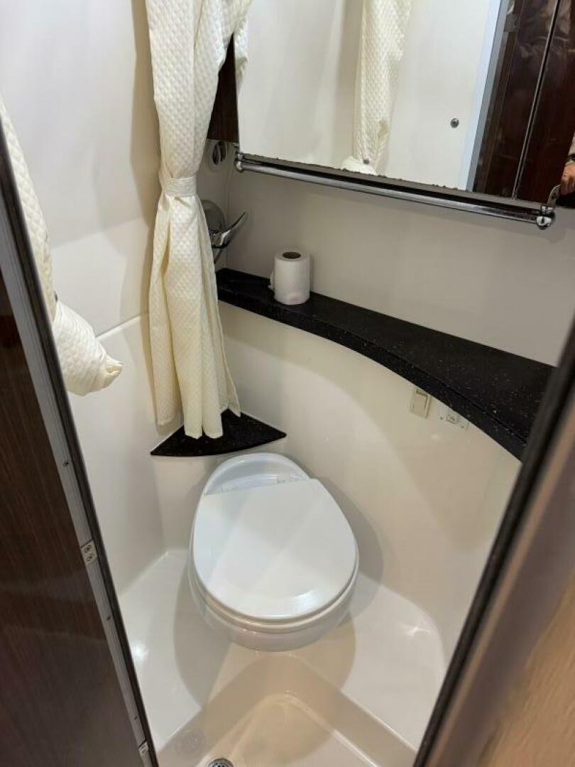 The cabin offers sleeping for 4 (including a queen-size mid-berth and convertible dinette), a full galley (with microwave, cooktop, fridge, and sink), and an enclosed head with shower—larger than many in its class.