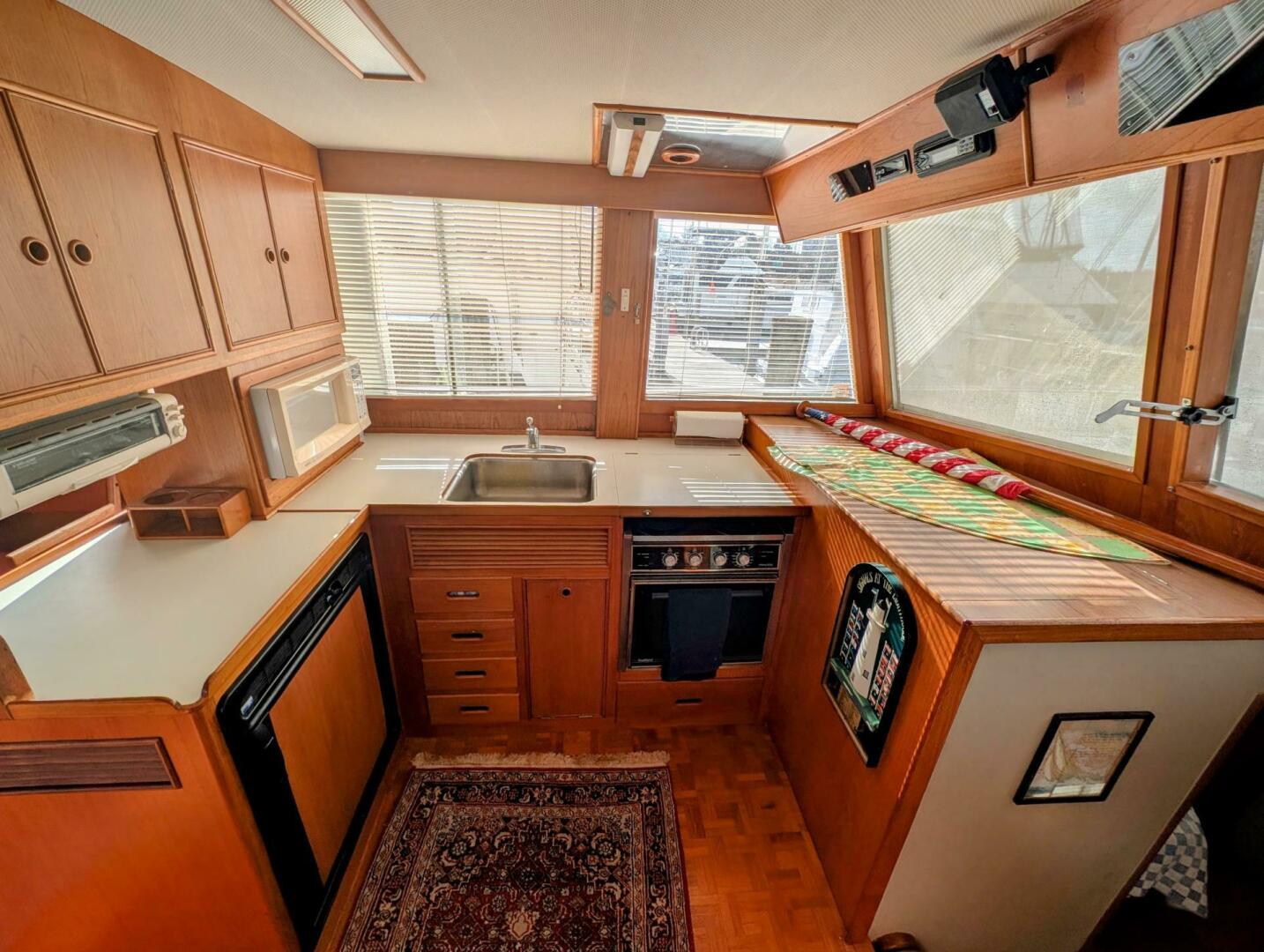 - Galley: The galley is an L-shaped "up" configuration to port, featuring a sink, oven, electric stove, deep freezer, and generous storage.