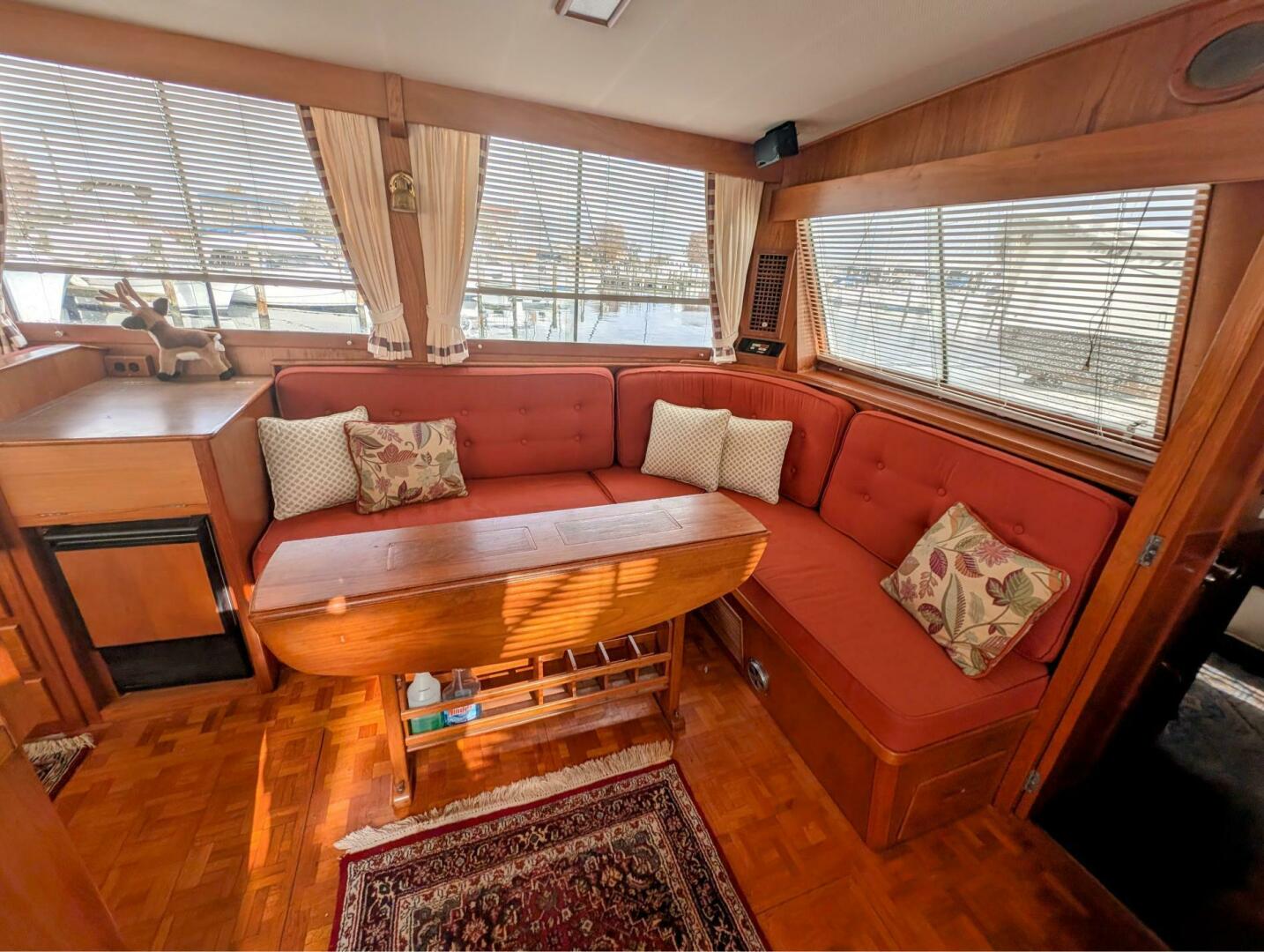 - Salon: The large salon has a lower helm station with doors to the port and starboard side decks, and comfortable L-shaped settees for entertaining or dining.