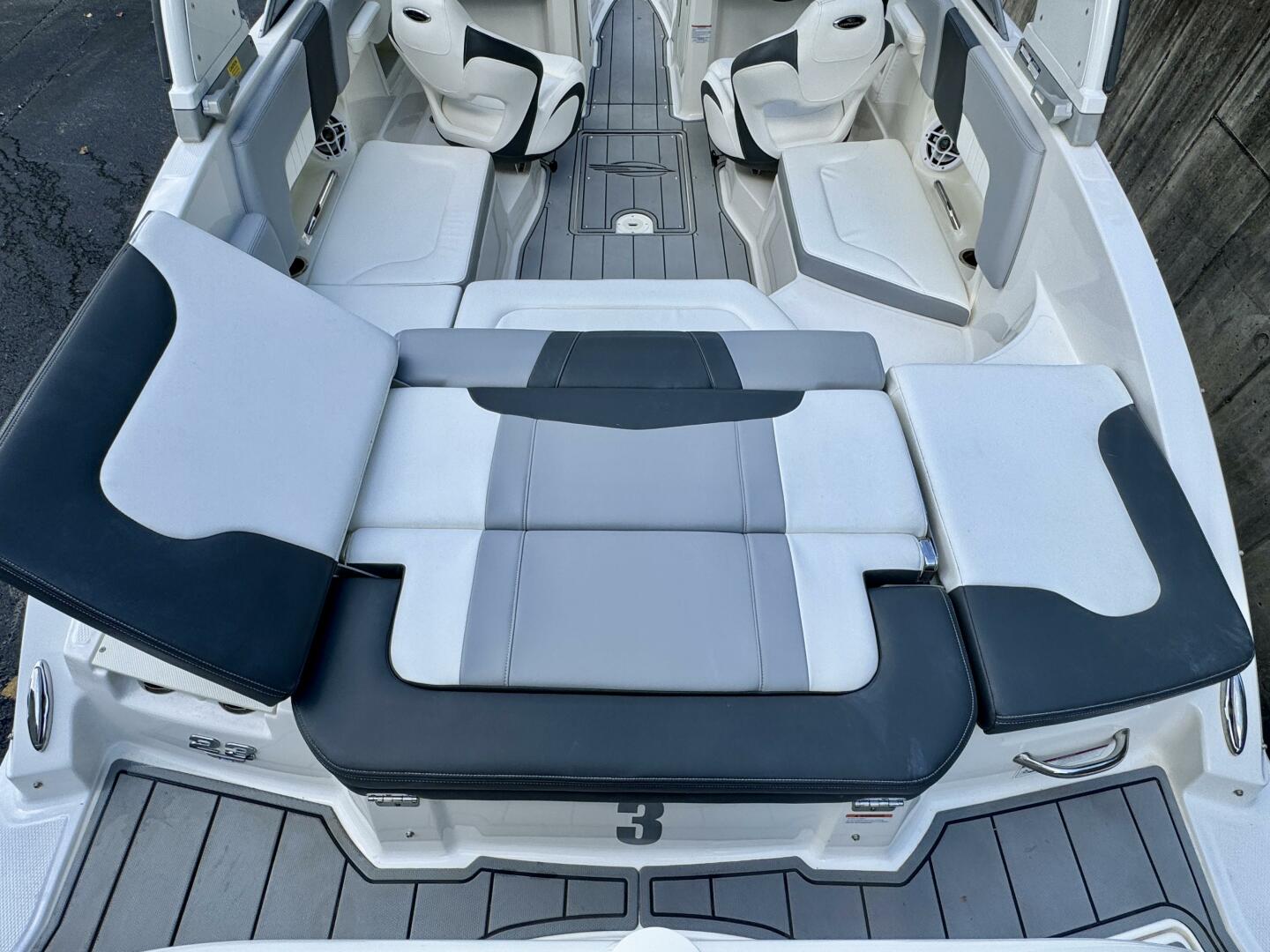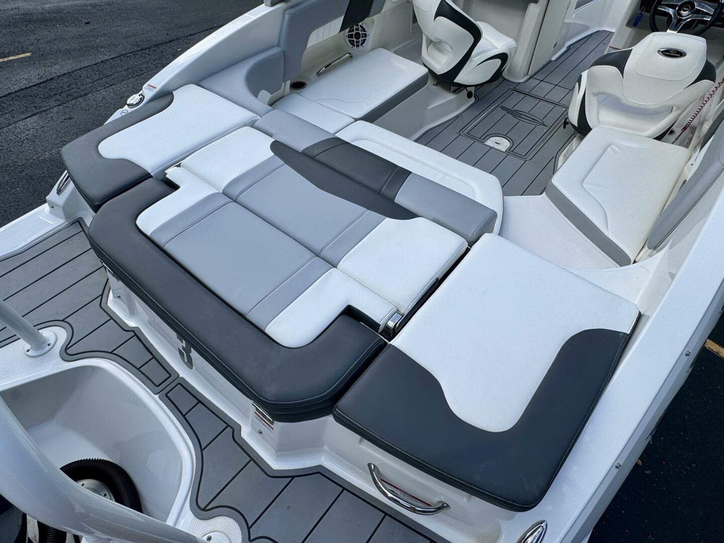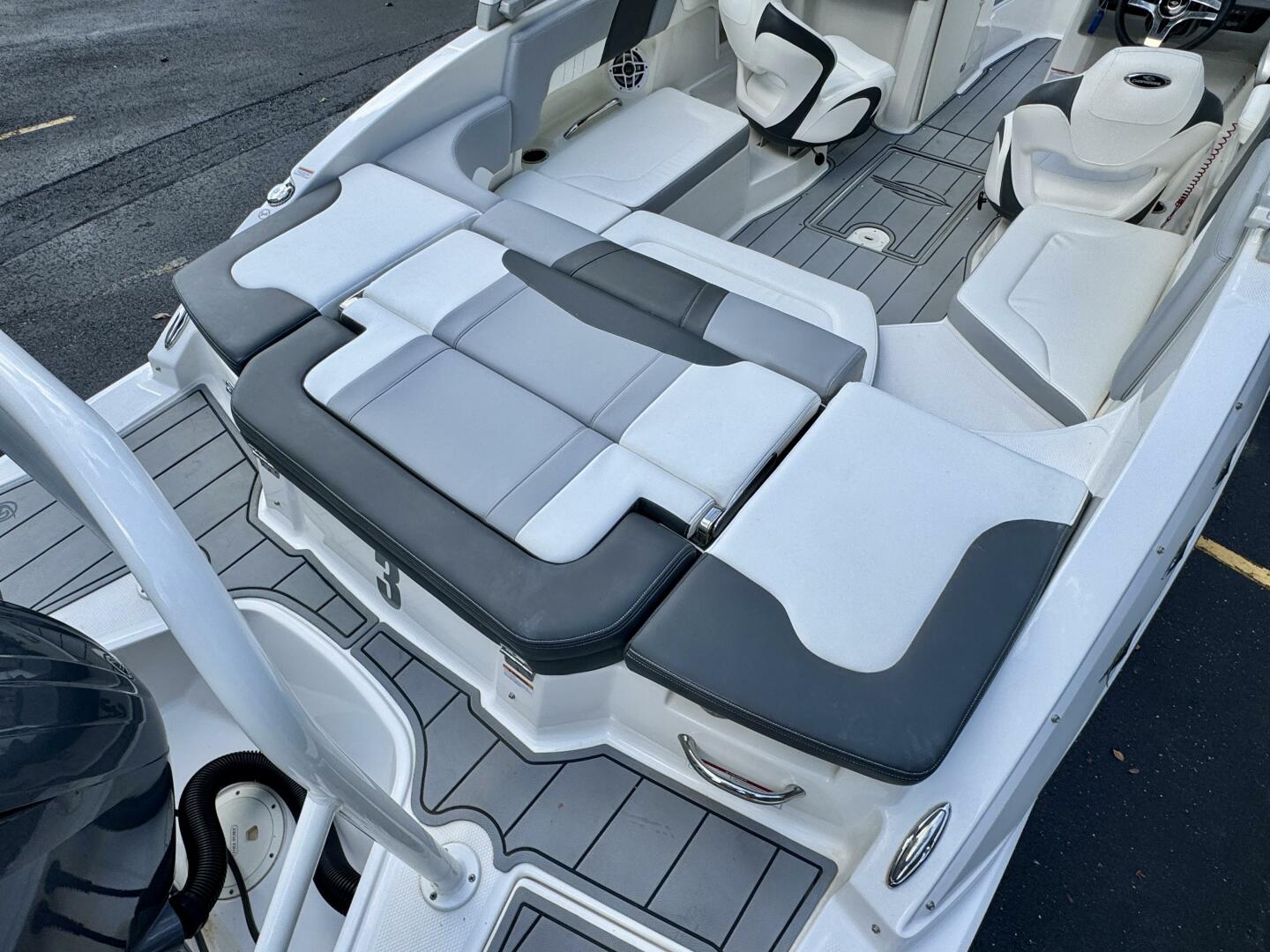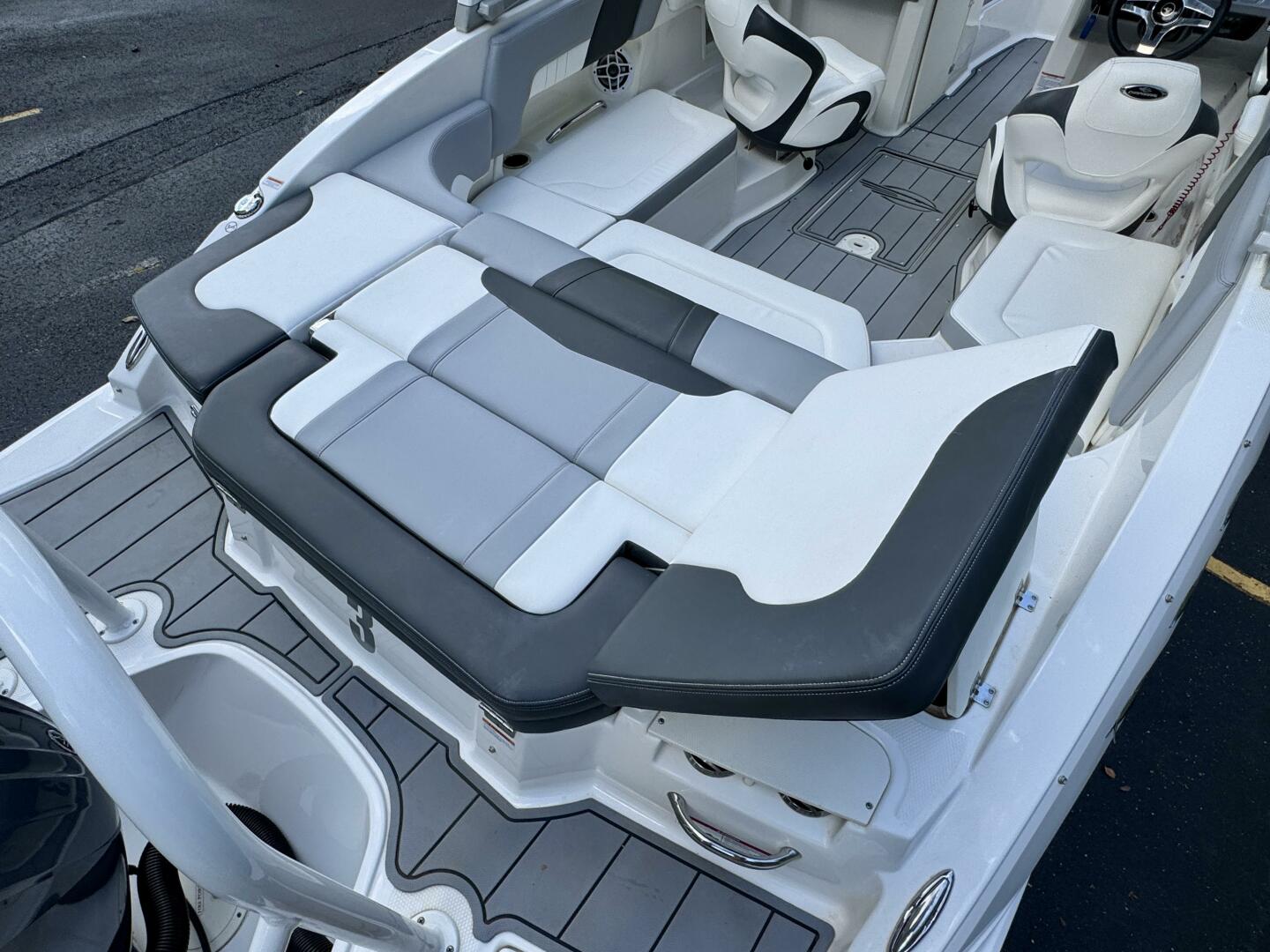 Integrated Swim Platform w/Sea-Dek Flooring, 4-Step Swim Boarding Ladder, Engine-Mount Trim Switch, Convertible SunLounge w/Flip-Up Reclined Seating (Port/Starboard Facing) and Pull-Up Rear Facing Seat Back,