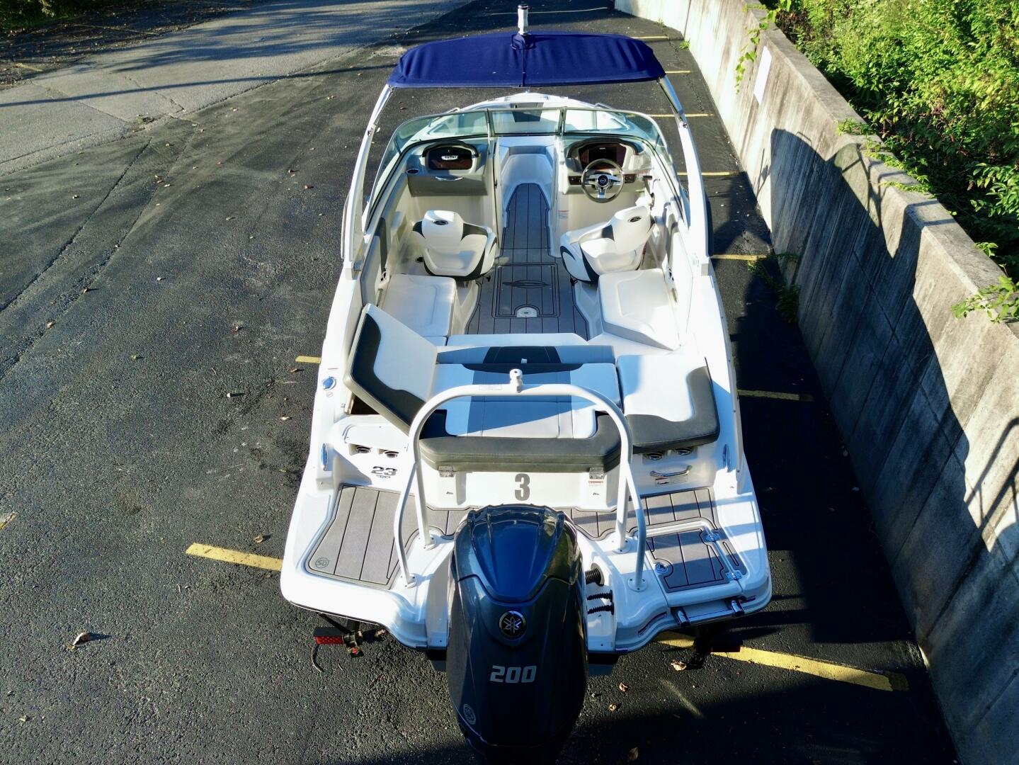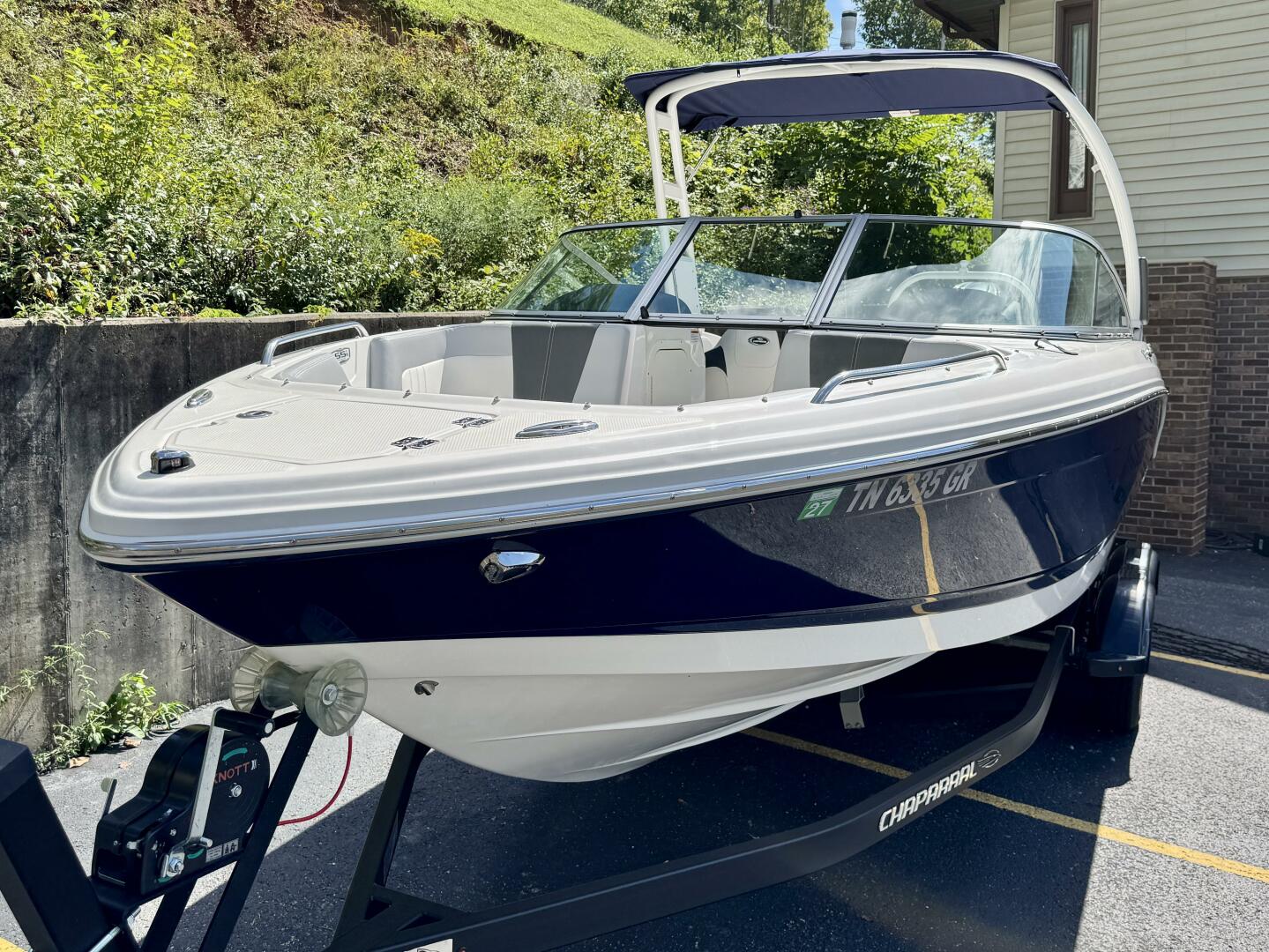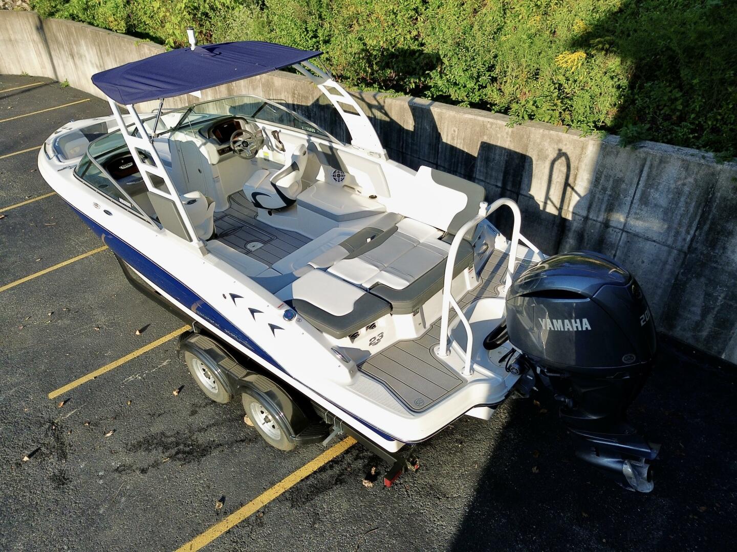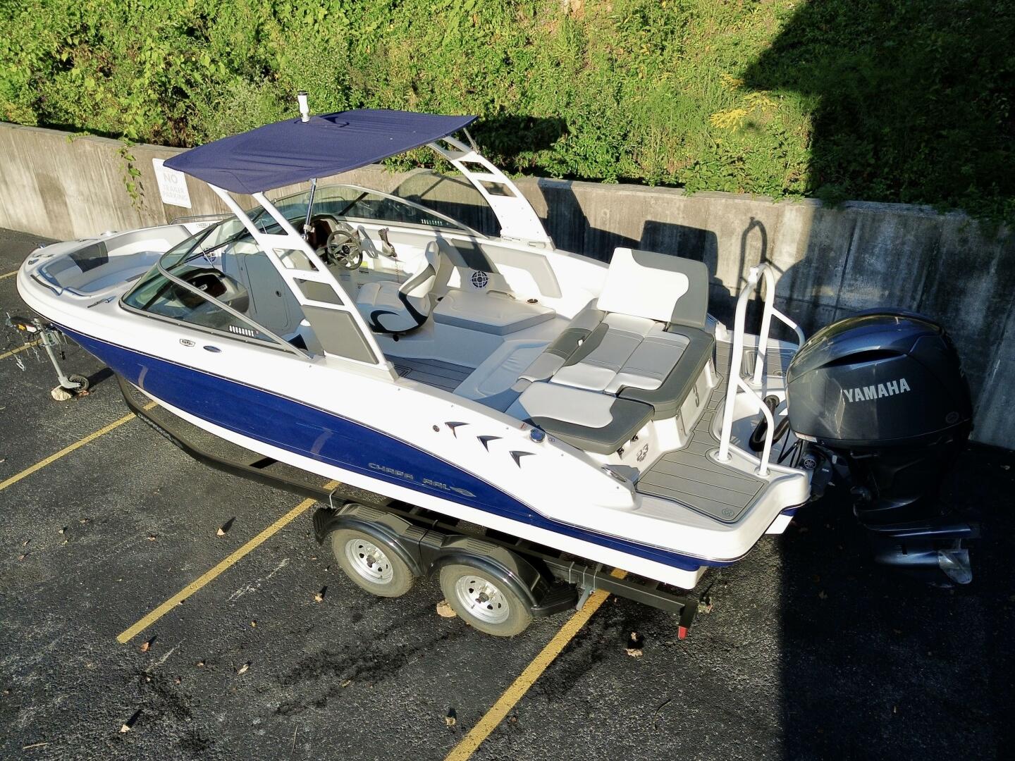 This 2024 Chaparral 23 SSi Outboard Powered Sport Boat For Sale on Norris Lake Tennessee is equipped with a 200HP Yamaha 4-Stroke Outboard Motor and features a folding Velocity wakeboard tower with tower-mount sunbrella bimini top, ski-tow bar, sea-dek covered swim platform with swim boarding ladder, transom walk-through with flip up lounge seating and a pull-up rear facing seat back, snap-in sea-dek cockpit flooring, dual bolster driver and passenger seats, sea-star hydraulic tilt steering wheel, a simrad color touchscreen display with GPS/Chartplotter/Depth/Fish Finder/Sonar plus water temperature, fuel economy, fuel flow rate, and other integrated engine data, a Clarion AM/FM/USB/Aux Input/Bluetooth/NOAA Weatherband/Satellite-Ready Stereo with (4)lighted cockpit speakers, (9)stainless steel cupholders, anchor storage locker, in-floor storage locker, sun lounge storage, plus two integrated ice chests (bow & cockpit), 12Volt power outlet, docking lights, courtesy lights, and a 2025 Coyote tandem axle trailer with dual disc brakes, a swing tongue, integrated tie-down straps, & more is included!