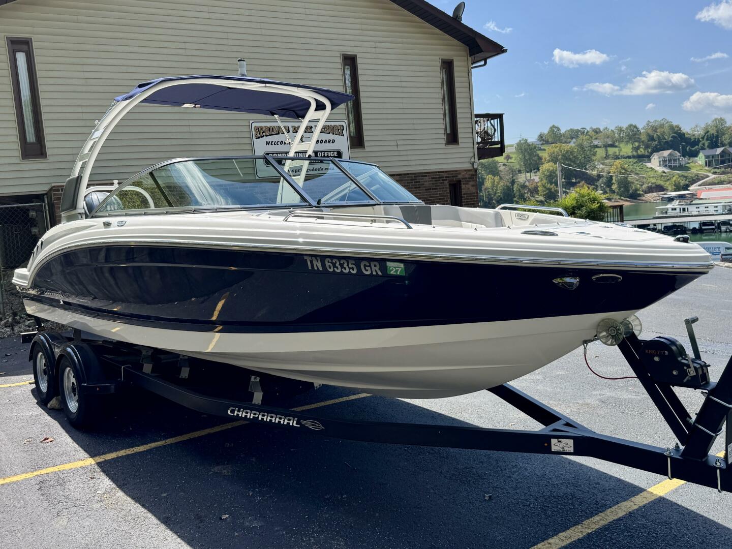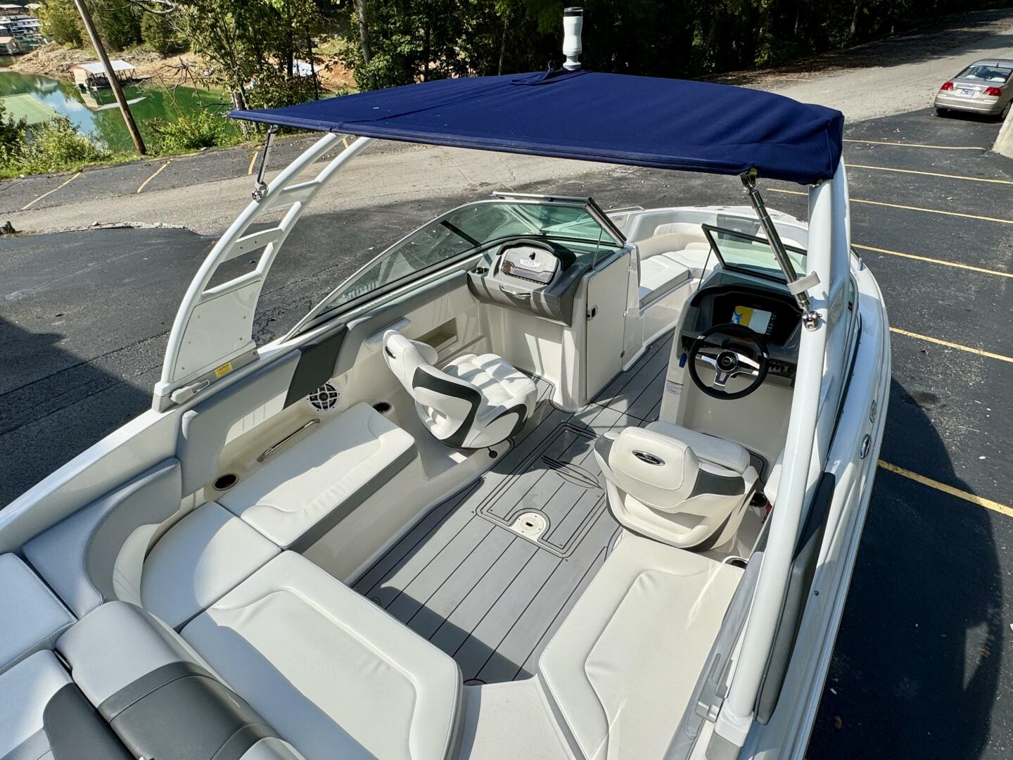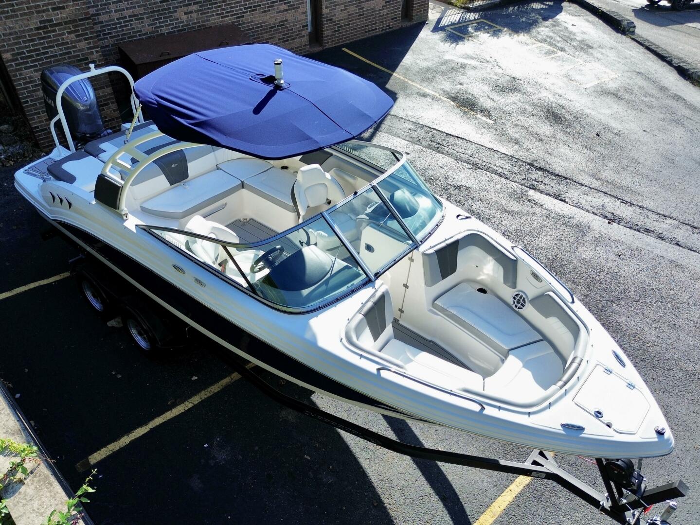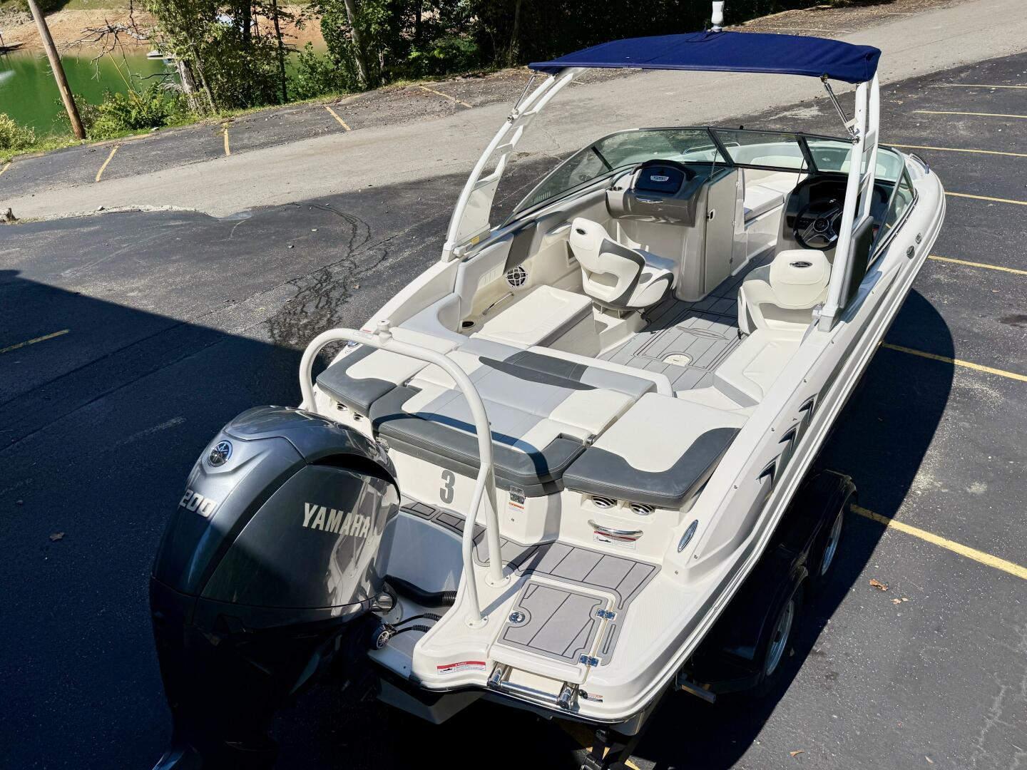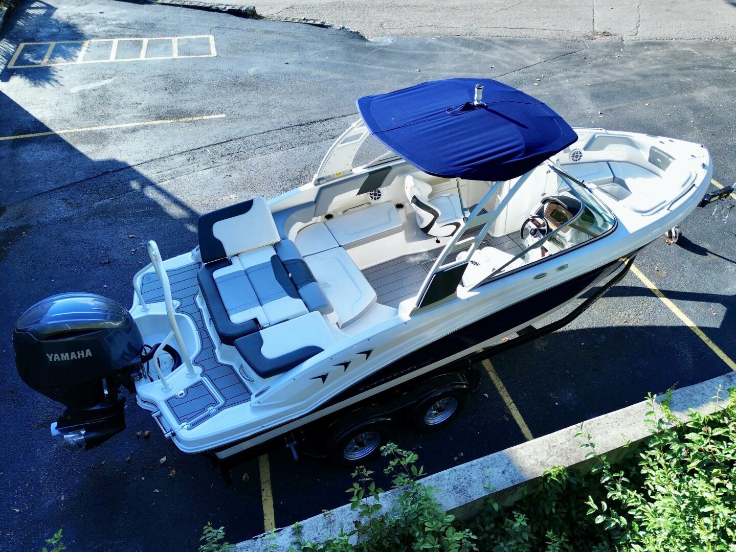 This 2024 Chaparral 23 SSi Outboard Powered Sport Boat For Sale on Norris Lake Tennessee is equipped with a 200HP Yamaha 4-Stroke Outboard Motor and features a folding Velocity wakeboard tower with tower-mount sunbrella bimini top, ski-tow bar, sea-dek covered swim platform with swim boarding ladder, transom walk-through with flip up lounge seating and a pull-up rear facing seat back, snap-in sea-dek cockpit flooring, dual bolster driver and passenger seats, sea-star hydraulic tilt steering wheel, a simrad color touchscreen display with GPS/Chartplotter/Depth/Fish Finder/Sonar plus water temperature, fuel economy, fuel flow rate, and other integrated engine data, a Clarion AM/FM/USB/Aux Input/Bluetooth/NOAA Weatherband/Satellite-Ready Stereo with (4)lighted cockpit speakers, (9)stainless steel cupholders, anchor storage locker, in-floor storage locker, sun lounge storage, plus two integrated ice chests (bow & cockpit), 12Volt power outlet, docking lights, courtesy lights, and a 2025 Coyote tandem axle trailer with dual disc brakes, a swing tongue, integrated tie-down straps, & more is included!