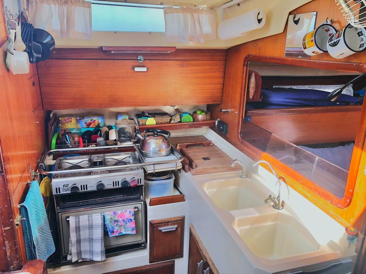 Bay du Vin has been a great sailing boat and home for us for the last 3 years. Her sturdy appearance and build have proven her to be a very good and steady sailer. She is well outfitted and has continued to have upgrades throughout the years, making her very comfortable for sailing, living aboard and lounging in the cockpit, The mahogany interior is attractive with a deceptively spacious, well-designed layout. This is a nice, comfy little boat.