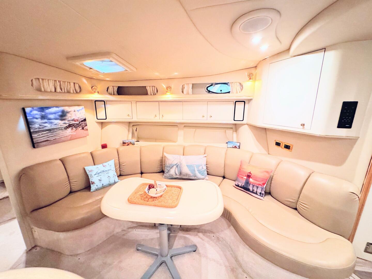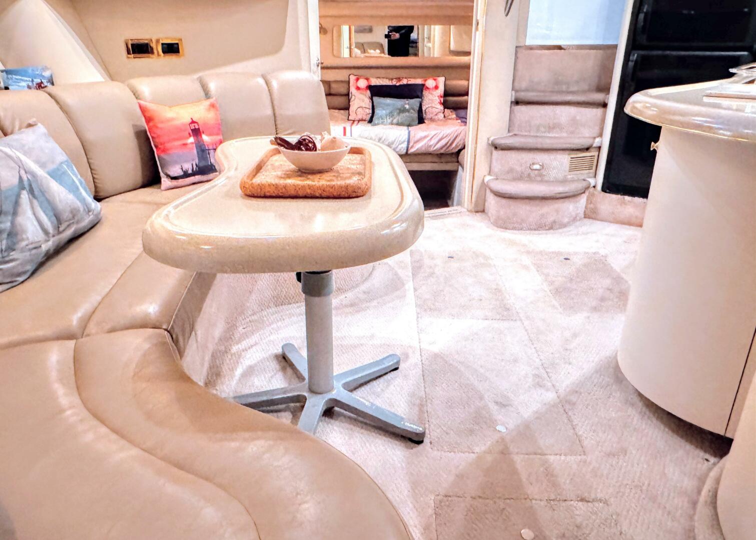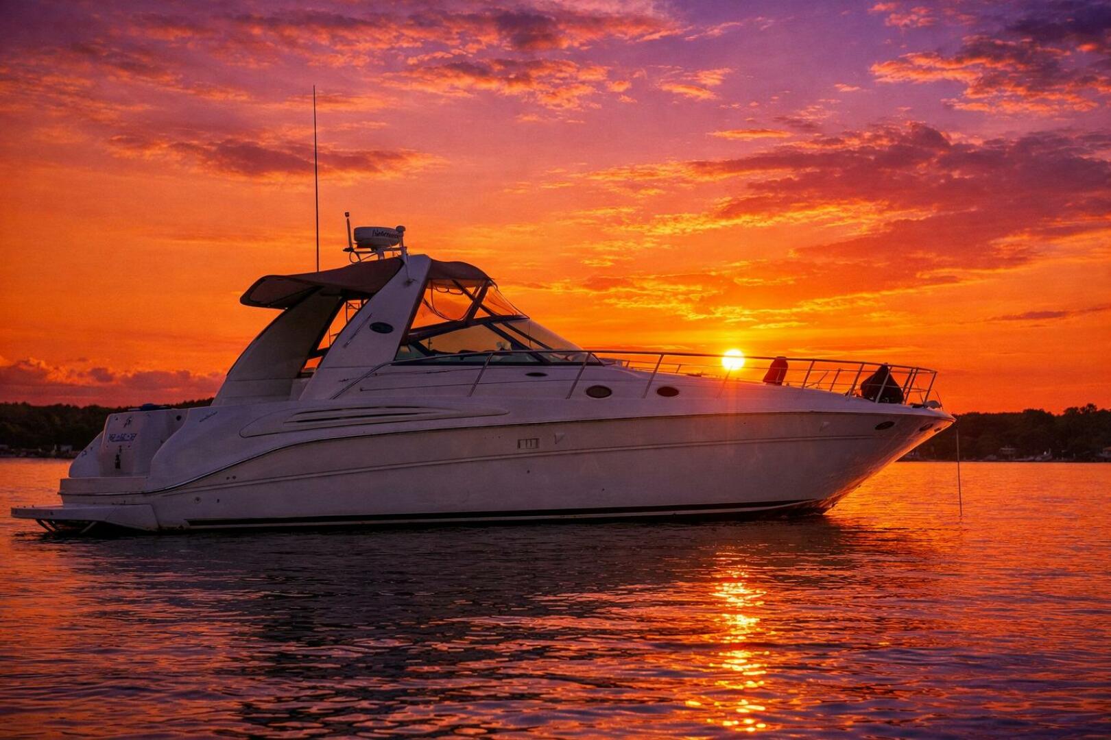 The Sea Ray 400 Sundancer is one of the most popular designs ever to hit the market is this size range and what an incredible layout. She includes an extra large mid-cabin that can be used as a large sleeping berth when converted, or a dinette seating area when just handing out inside her cabin. Her raised-helm design offers surprising amount of headroom and there is a sliding privacy door that encloses the dedicated guest head, as well as the generous sleeping arrangements.In the cockpit there is a fiberglass sport spoiler with overhead BLU LED lighting, generous seating arrangements, and portside wet bar which make the cockpit an inviting place to pass time with friends.The 400 Sundancer is powered by twin Caterpillar 350-hp DIESEL V-drives. The large cockpit area has bench seating on three sides and a portside wet bar with faucet and icemaker, making it ideal for large gatherings. A transom door leads to the wide swim platform. At the helm, a double companion seat keeps company with the adjustable captain's chair. The premium electronics package includes Raymarine GPS and Radar, as well as a new Raymarine VHF radio, Raymarine touchscreen, depth finder and autopilot. The forward deck sunpad gives sun worshipers a place to relax. The built-in raised toe-rail and through-bolted stainless steel bow rail make passage to the foredeck sure and safe. Below, the salon area features a curved sofa, perfect for relaxing before dinner; add the fiberglass table and it's a perfect dining spot. Later, it becomes the perfect sleeping spot for overnight guests. With central heat, air conditioning, and TV - VCR - radio combo, this is your home away from home. The Sundancer berth, or mid-stateroom, is a conversation area during the day and converts to a double berth at night. In the master stateroom is a full-size pedestal bed and a private entertainment center. Cedar-lined hanging lockers and port and starboard vanities with cabinets below provide plenty of storage. With access from the salon and the forward stateroom, the master head includes a VacuFlush toilet, a vanity with sink, and full stand-up fiberglass shower.