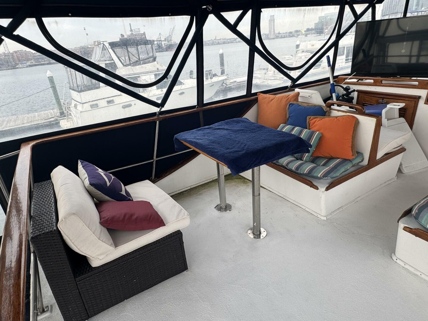 The trunk cabin has been equipped with a custom hardtop, two sofas port and starboard and one forward, along with full isinglass enclosure to create a unique entertainment and seating area that is a continuation of the flybridge area, one level down. There is nonskid decking throughout this area also.