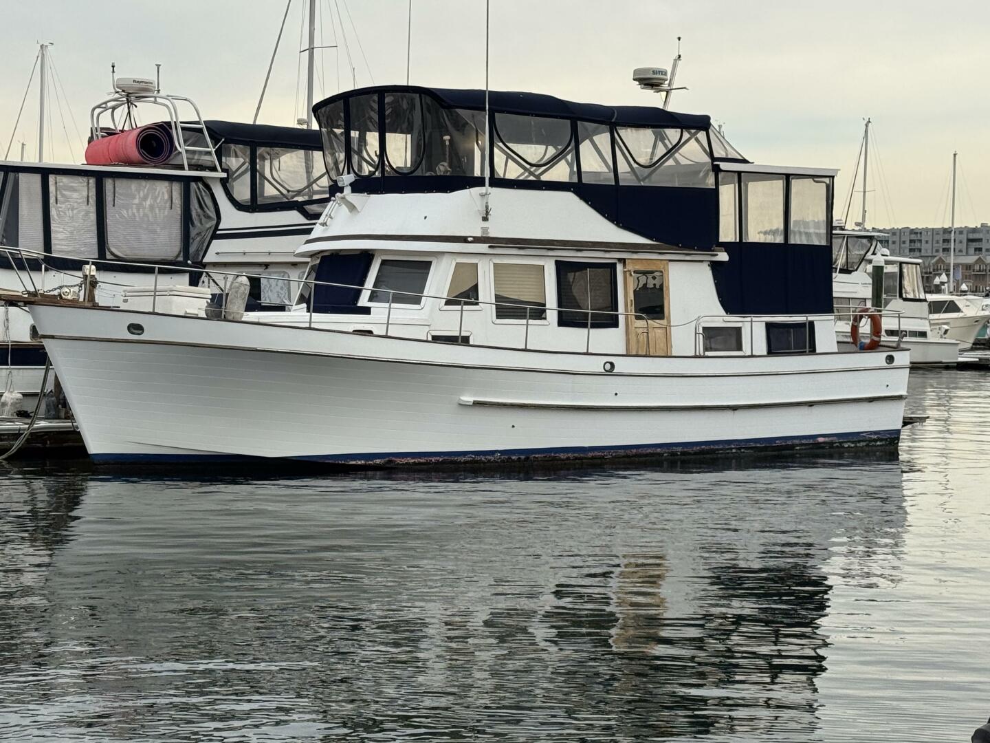 Yo Mama is a 1981 Marine Trader Double Cabin trawler. Powered by twin 120HP Ford Lehman diesel engines, she offers an upgraded windlass system with switching at the bow and both helms, an upgraded hydraulic steering system and a custom-built trunk deck hardtop.