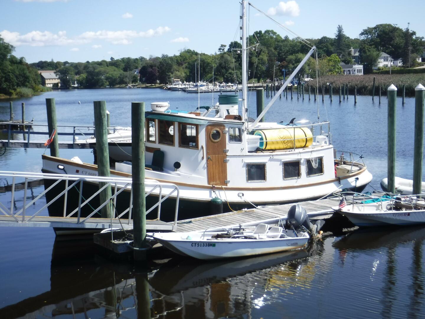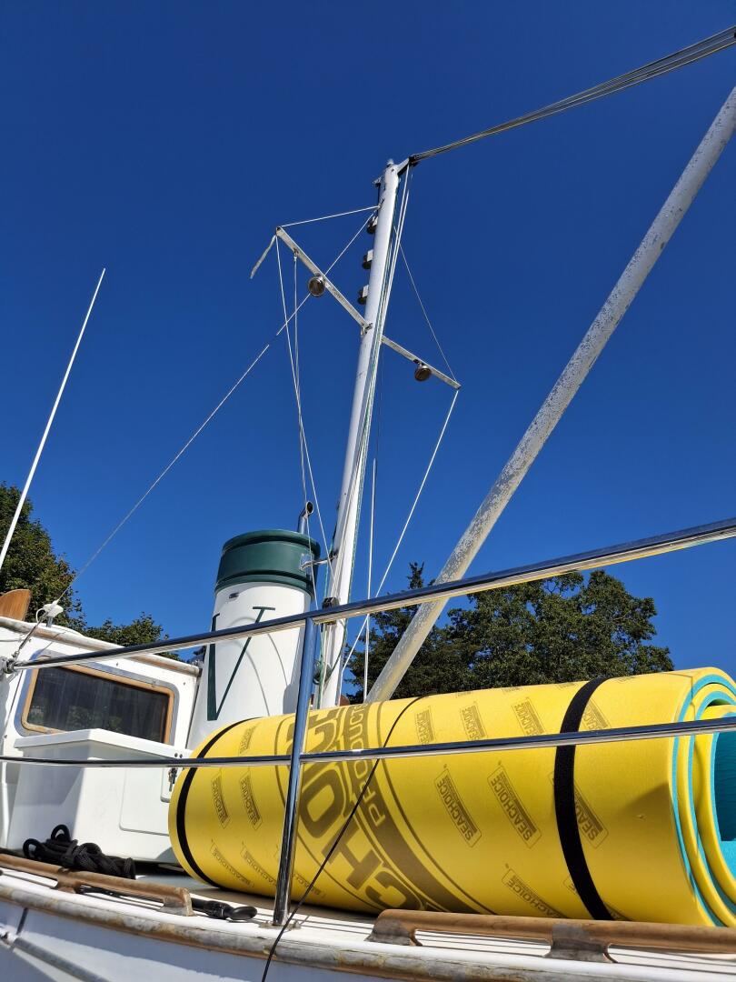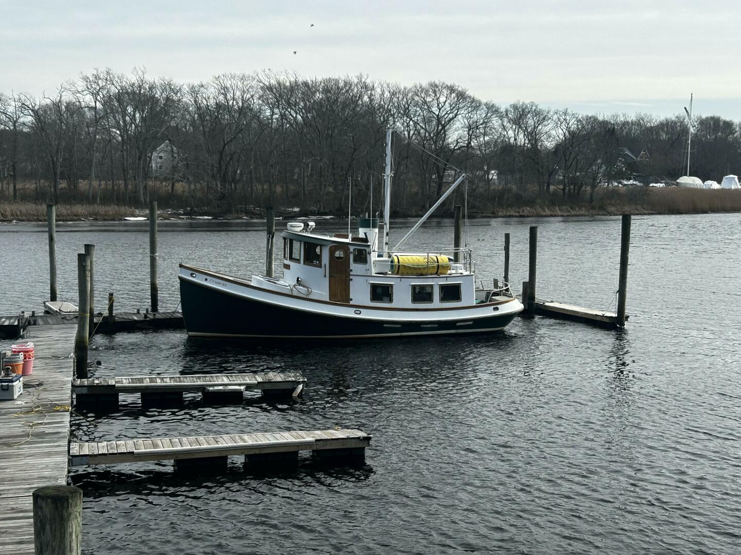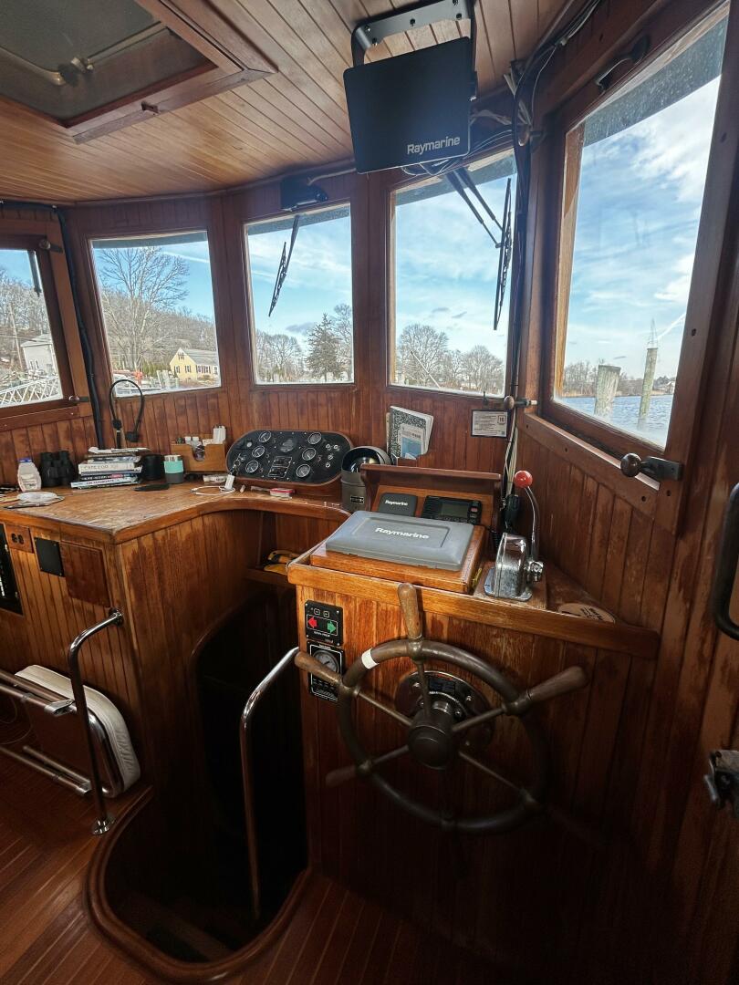 Great cruiser, liveboard or Gunkholer. Sleeps 5, Split head arrangement, Full Galley, Dual AC/Heat, Electric windlass anchor, St Croix Davits, Pudgy Dinghy and Torqeedo Electric motor. Original Mast and Boom, Raymarine Electronic's including Color Chartplotter/GPS and Radar. Floscan and Autopilot. 2 New AGM 8-D Batteries, New Starter, Very Miserly on fuel too Mechanical and Engine Detail Yanmar 4LH-DTE 170-HP Hours: 7kts- 1.8-gal@hour & 8kts-2.75-gal@hour Transmission Hurth Model HBW 50 (2.73:1) Kingston Thrust Bearing Prop 3-blade bronze 18X22 (right) with shaft line cutter Engine Controls Panel in pilothouse with engine and trans oil pressure gauges DC plug engine stop windshield wiper control oil and water temp DC volts for house and start batteries Tankage Fuel 250-gal Water 195-gal Holding 40-gal Bow Thruster Vetus 3kW 50 Series A/C above sink cools the main cabin and galley A/C unit above the stateroom's hanging locker SpeedSeal for raw water pump Hull soda blasted and stripped and epoxy barrier coat applied (West System)
