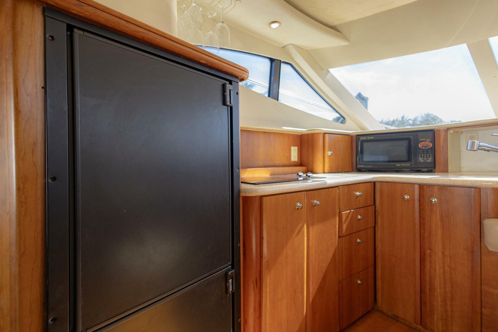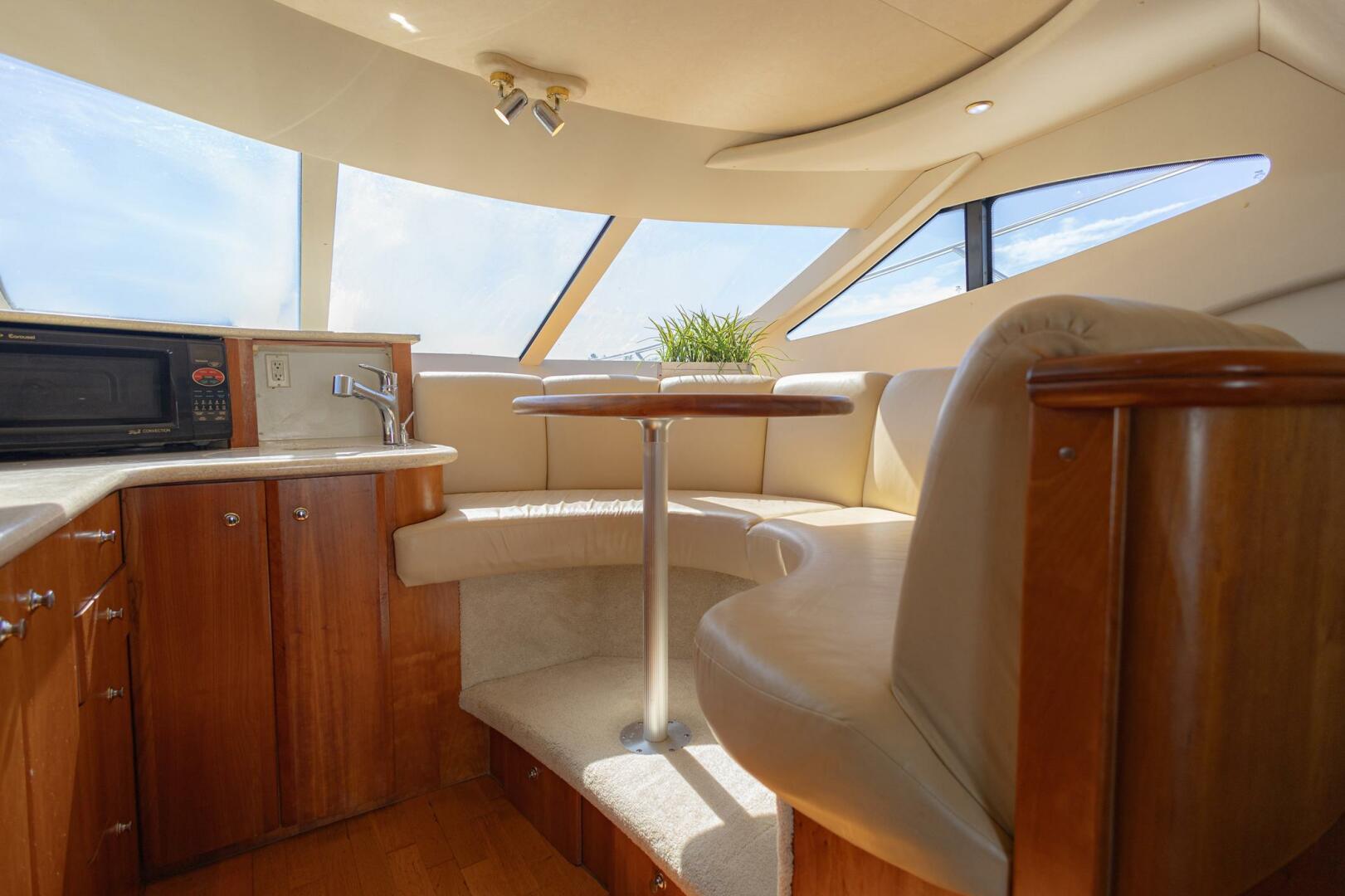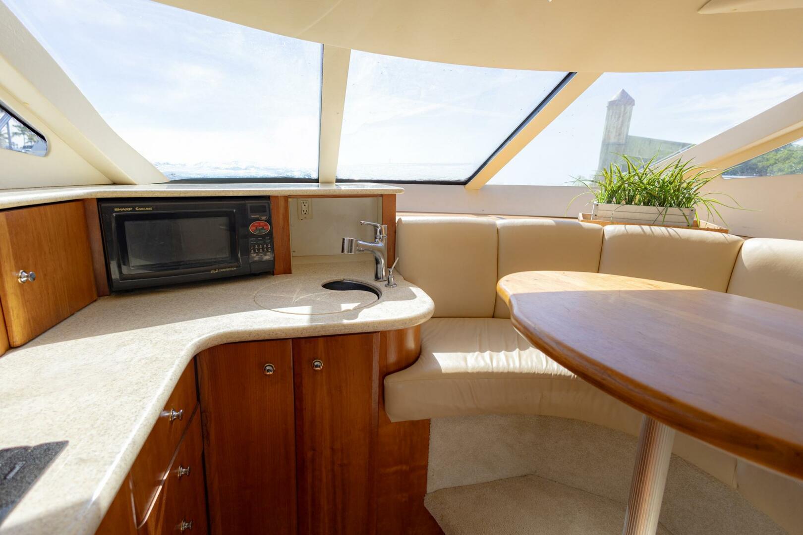 See for yourself why the Silverton 410 Sport Bridge has been one of the most successful yachts in her class for family cruising, liveaboard and yacht exploration. This Fly-Bridge yacht combines her sporty exterior styling with an exceptionally spacious and well-appointed interior. She’s armed with newly overhauled engines and a long list of updated equipment ready to take you to your dream destination in style and safety. Step aboard and you will see a very well-maintained yacht. Smell the salty ocean air (and nothing else). Below deck, the Silverton 410 offers one of the largest interiors in its class. full wraparound windows. Her molded stairways and wide side decks make movement throughout the boat safe and easy — ideal for families, pets, and entertaining. Highlights include a full-beam salon, a raised galley, two private staterooms, and a split head and shower, delivering the space and comfort of a much larger yacht. The cockpit is your extra-large back porch with a spectacular view. Up on the Bridge in command of your yacht, your guests will relax in luxury while lounging away. This is the ideal yacht for a floating condo or live aboard scenario.
