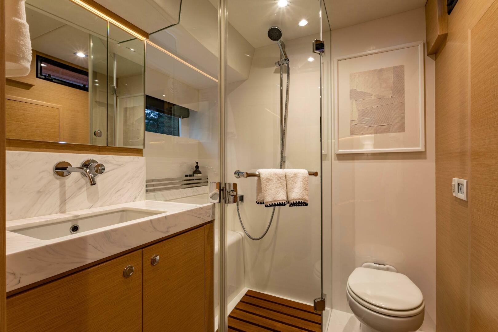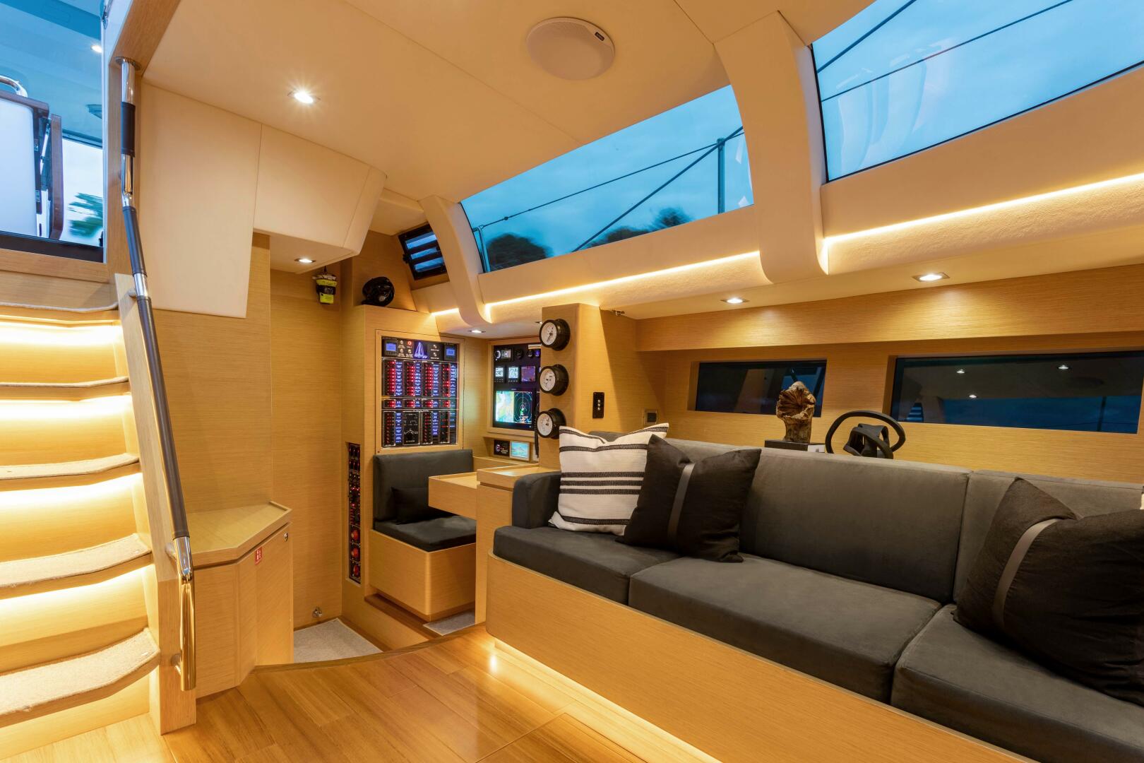 | Notable Upgrades: "Vanishing Point" features several practical upgrades, including a 2kW solar array for added energy efficiency and a reliable marine inverter air conditioning system that keeps the interior comfortable while minimizing generator use. The improved layout and upgraded electronics enhance functionality for everyday use on the water. |