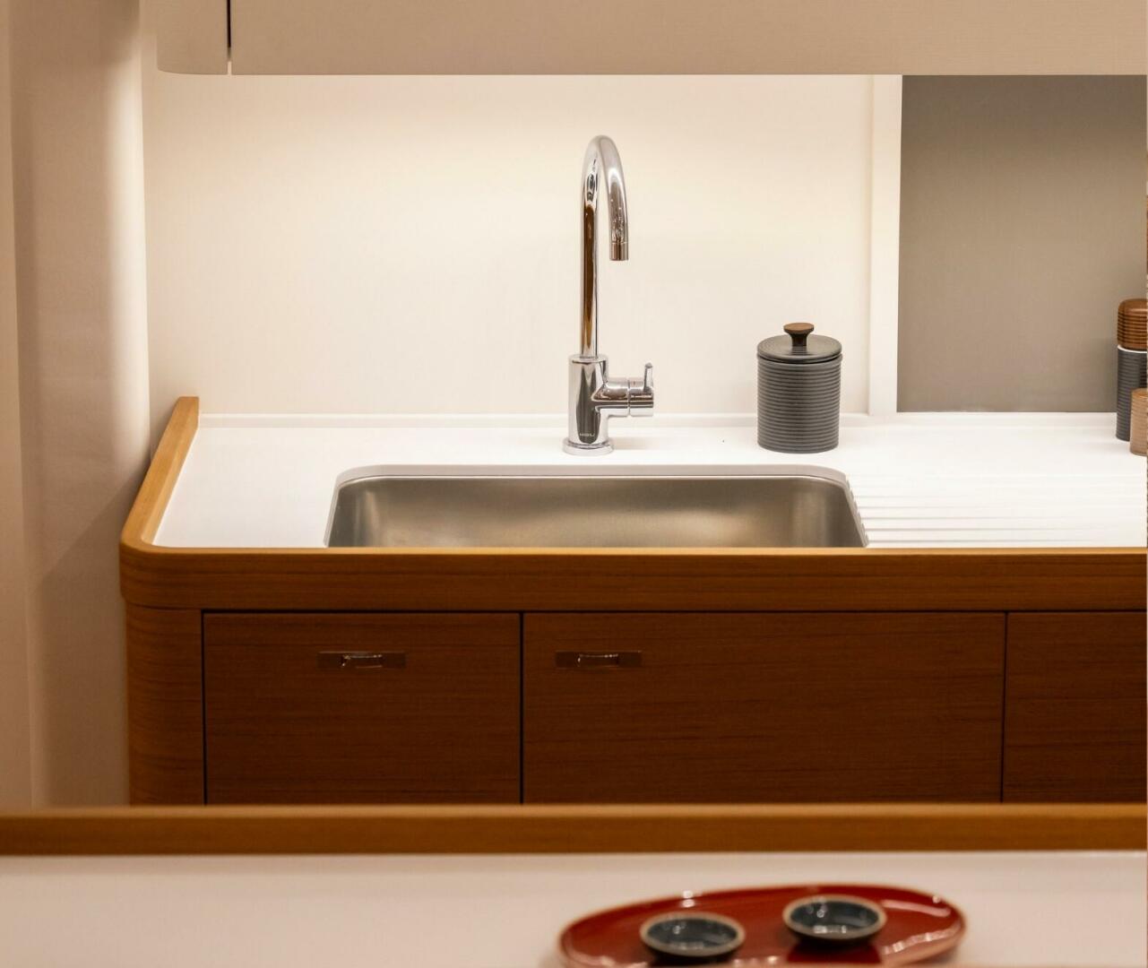 Below decks, the First 60’s interior elevates life at sea with spacious, well-lit accommodations that blend comfort and function. A cozy dining area faces the owner’s navigation corner and sofa, while the full-beam galley — with elongated worktop and abundant storage — supports efficient meal preparation even under sail. The owner’s cabin is a standout retreat with a large walk-around, forward-facing berth, generous natural light, and tranquil sea views that enrich long passages or overnight stays.