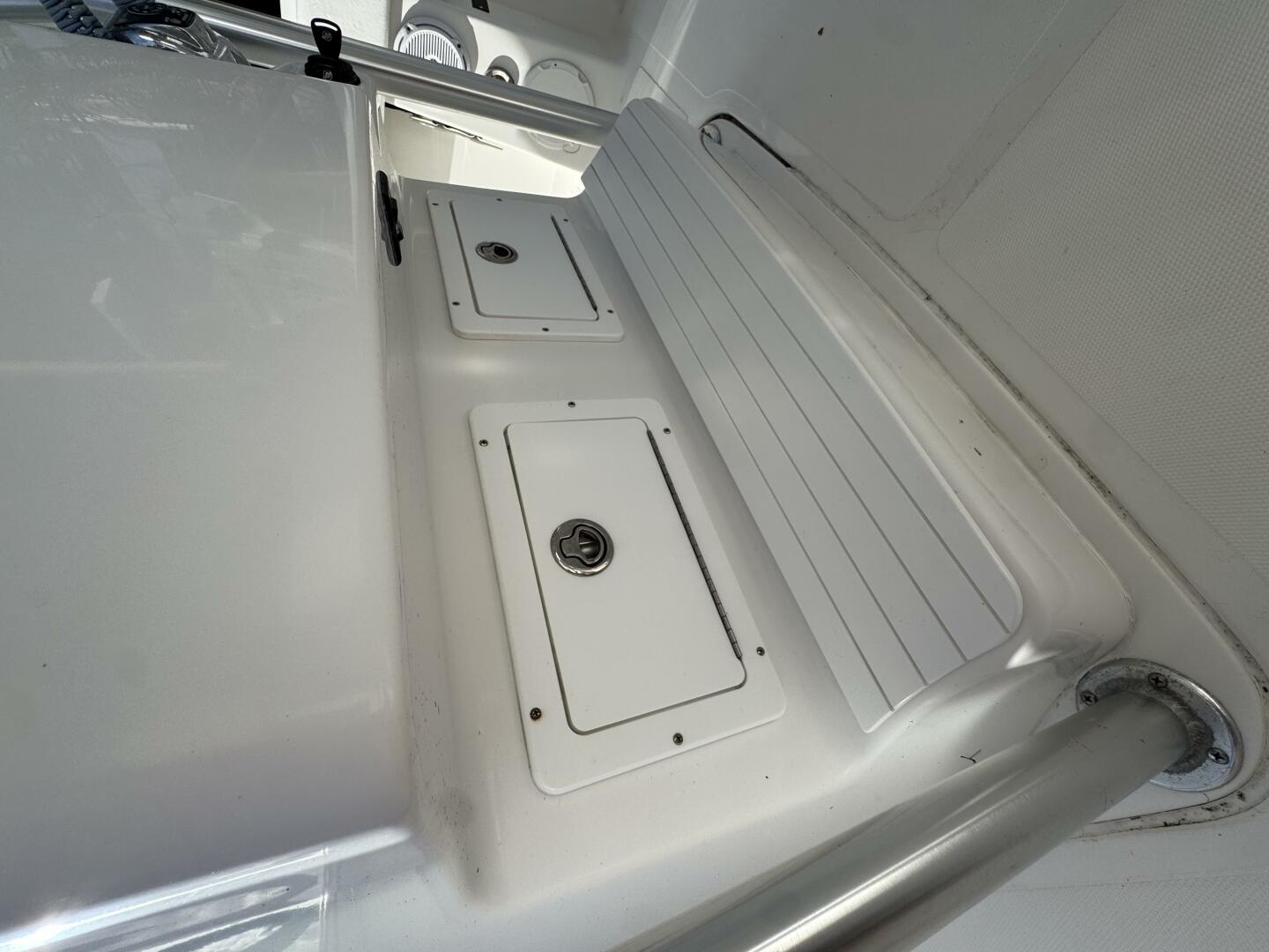 The cockpit is purpose-built for anglers, featuring a forward fish box, dual aft fish boxes, and multiple livewells, including a leaning post tackle station with integrated livewell and an additional transom livewell—ideal for tournament fishing or extended days offshore. Trim tabs enhance ride control and efficiency, while the windlass anchor system makes anchoring effortless and secure.