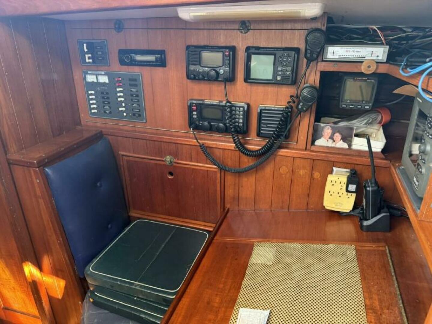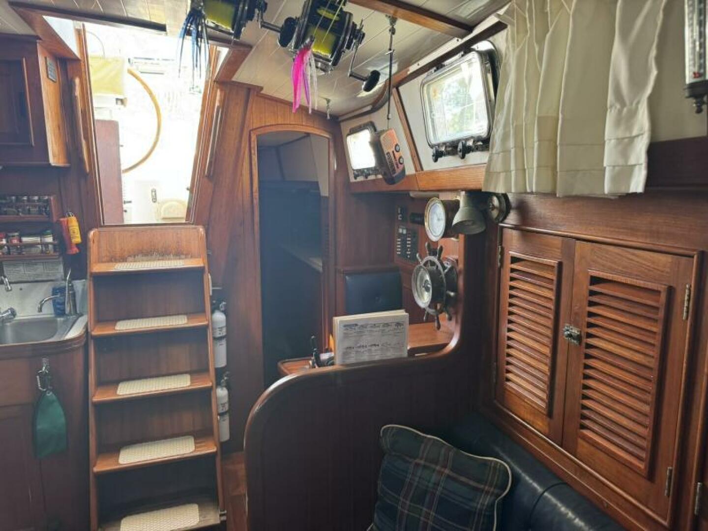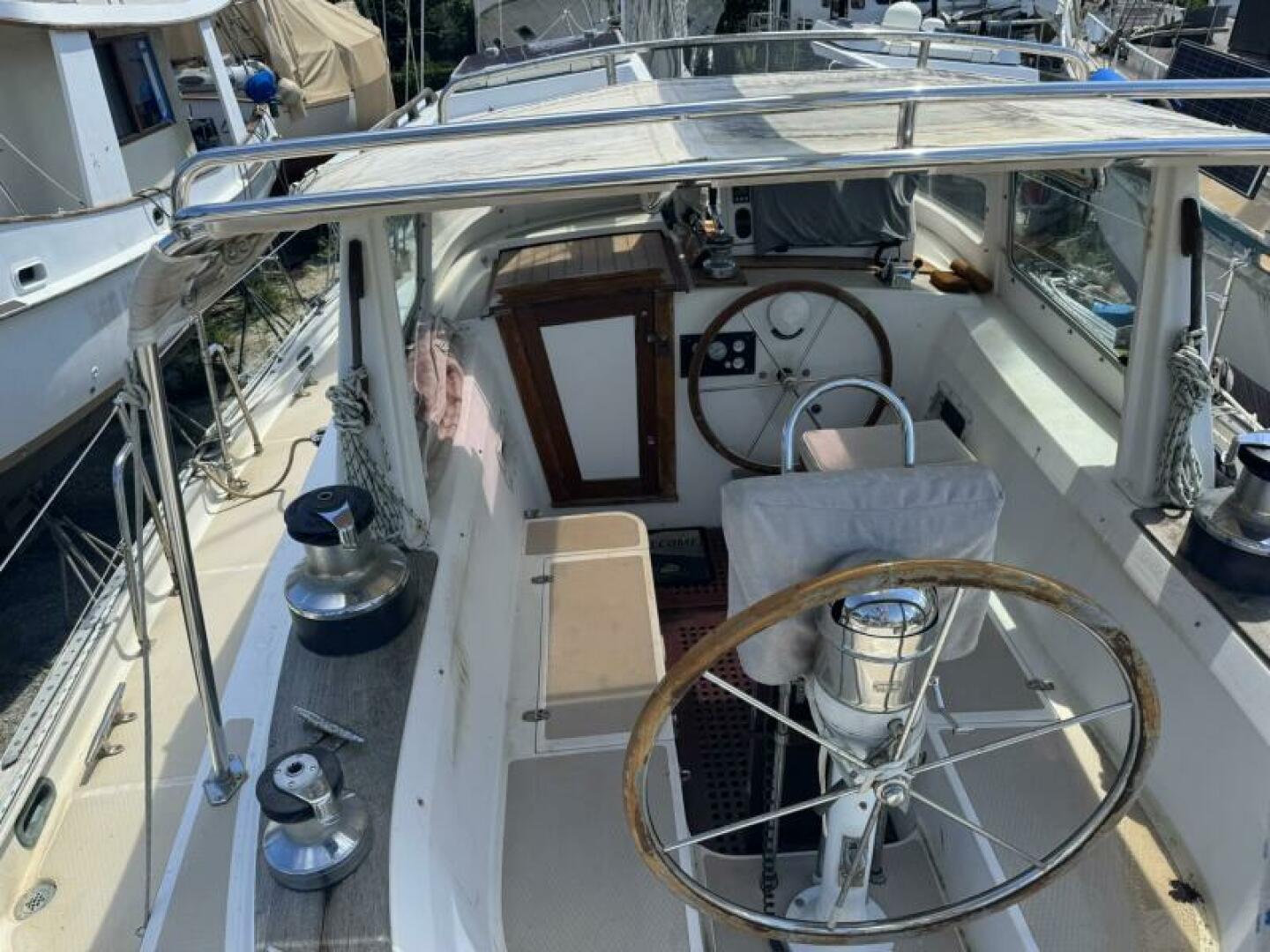 Set up for true bluewater cruising with hydraulic assists, three steering systems, and a Navtec