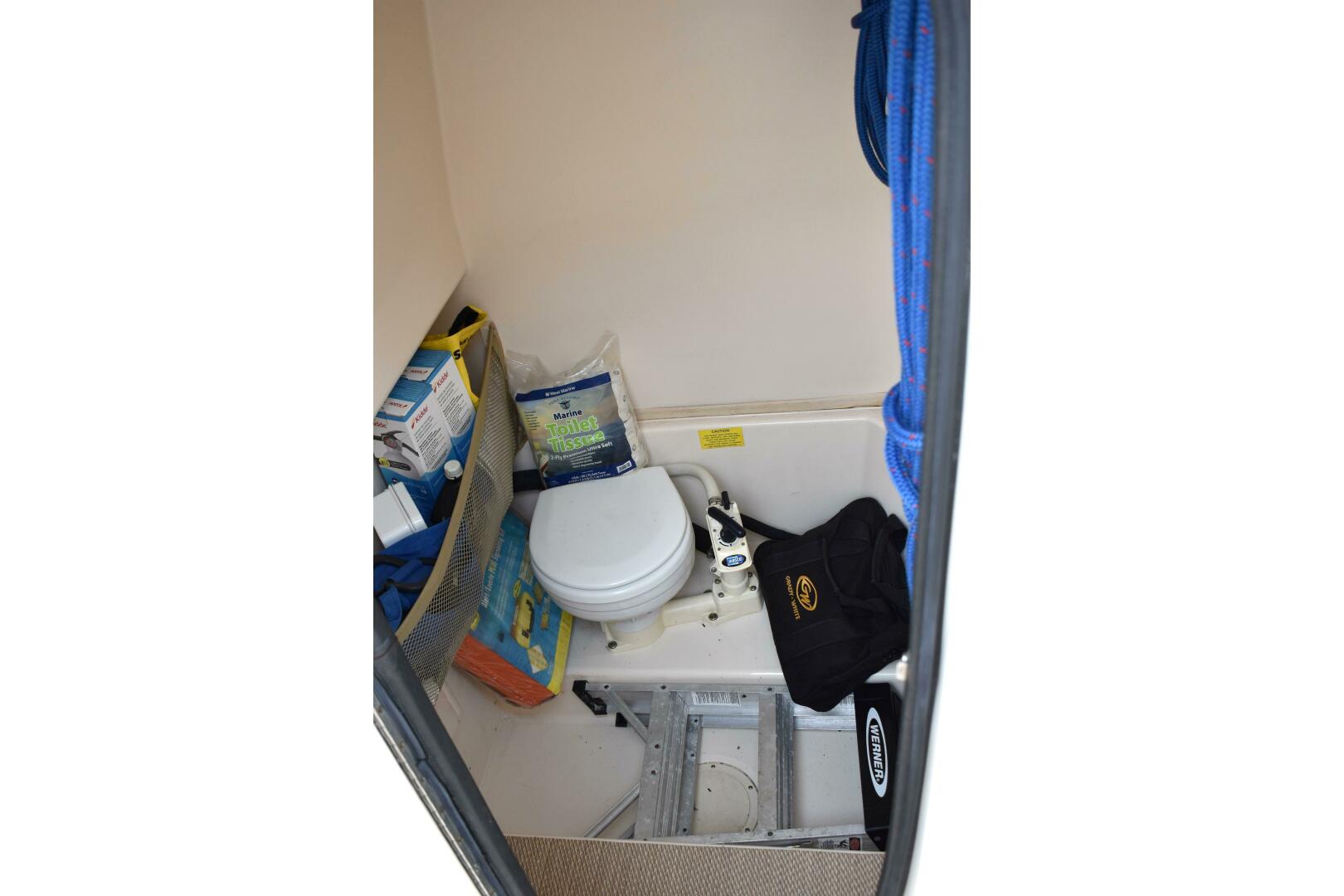 - Head - lockable console w/stand up head area, bulk storage & marine head w/macerator, 10-gallon (37.9 l) holding tank & pump out