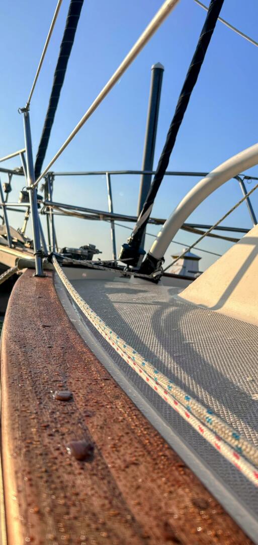 Brightwork: Teak Toe/Cap Rail, Bowsprit, HelmSeat, Eyebrow etc. (All bright work striped and refinished (Semco), (New Fall 2024), (Touched up Summer 2025)