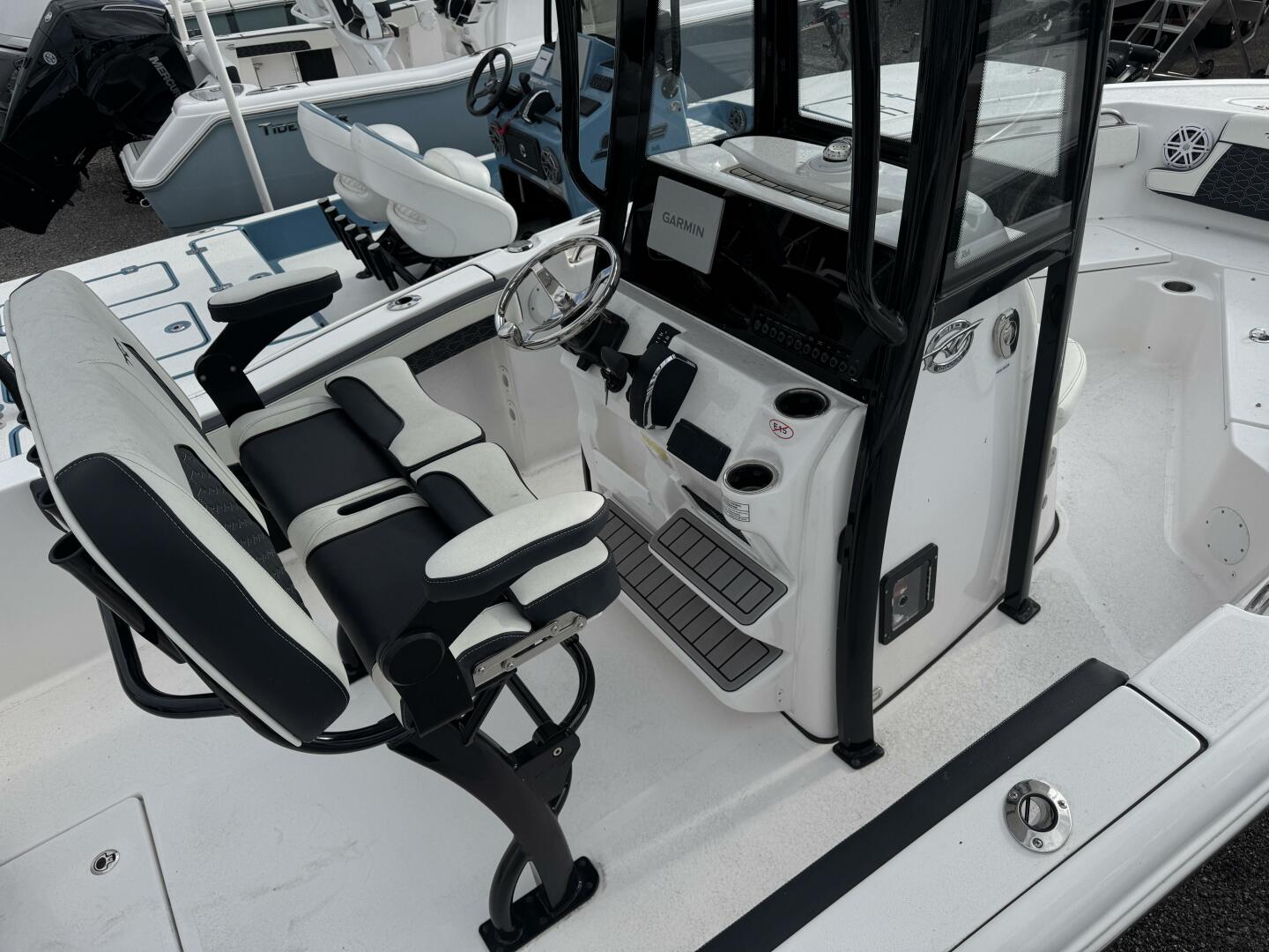 2026 Tidewater 210 CC Adventure powered by a Mercury 175XL FourStroke DTS. Features dual Garmin 943xsv displays, thru-hull transducer, trim tabs w/ indicators, SeaStar steering, fresh water shower, full hull color, and stainless prop. $79,999