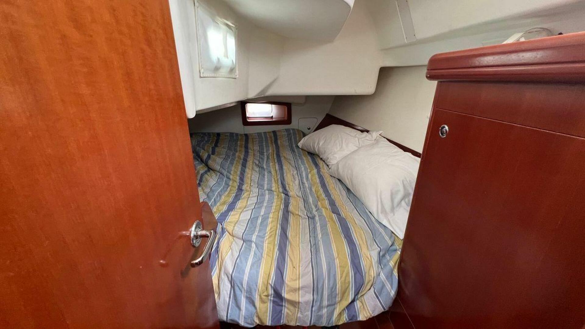 2 private cabins, each with double berths. Large head with separate enclosed shower. Convertible saloon seating. L-shaped galley with microwave and propane stove, refrigeration, and ample storage. Nav station. Teak joinery throughout. Sleeps 4 comfortably, 6 with saloon.