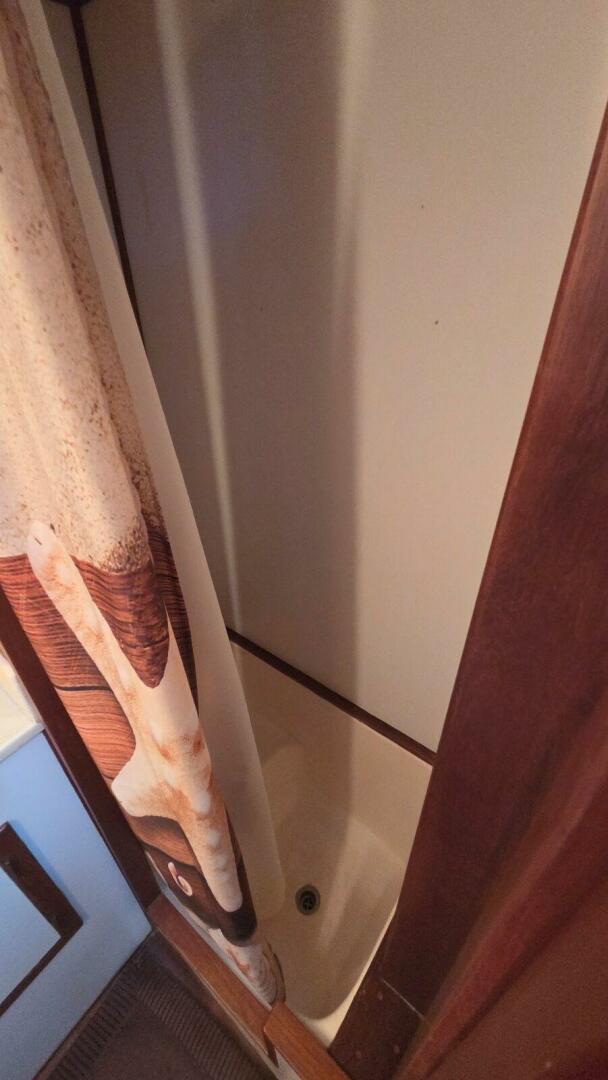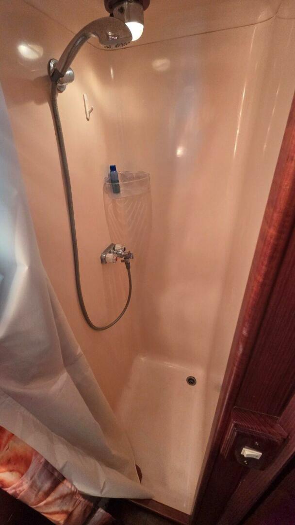 The owner’s head is private and accessed directly from the aft stateroom. It is well laid out and functional, featuring a vanity sink with storage and a full stall shower. This space is designed for everyday use while cruising or living aboard, offering comfort, privacy, and room to move without feeling tight.