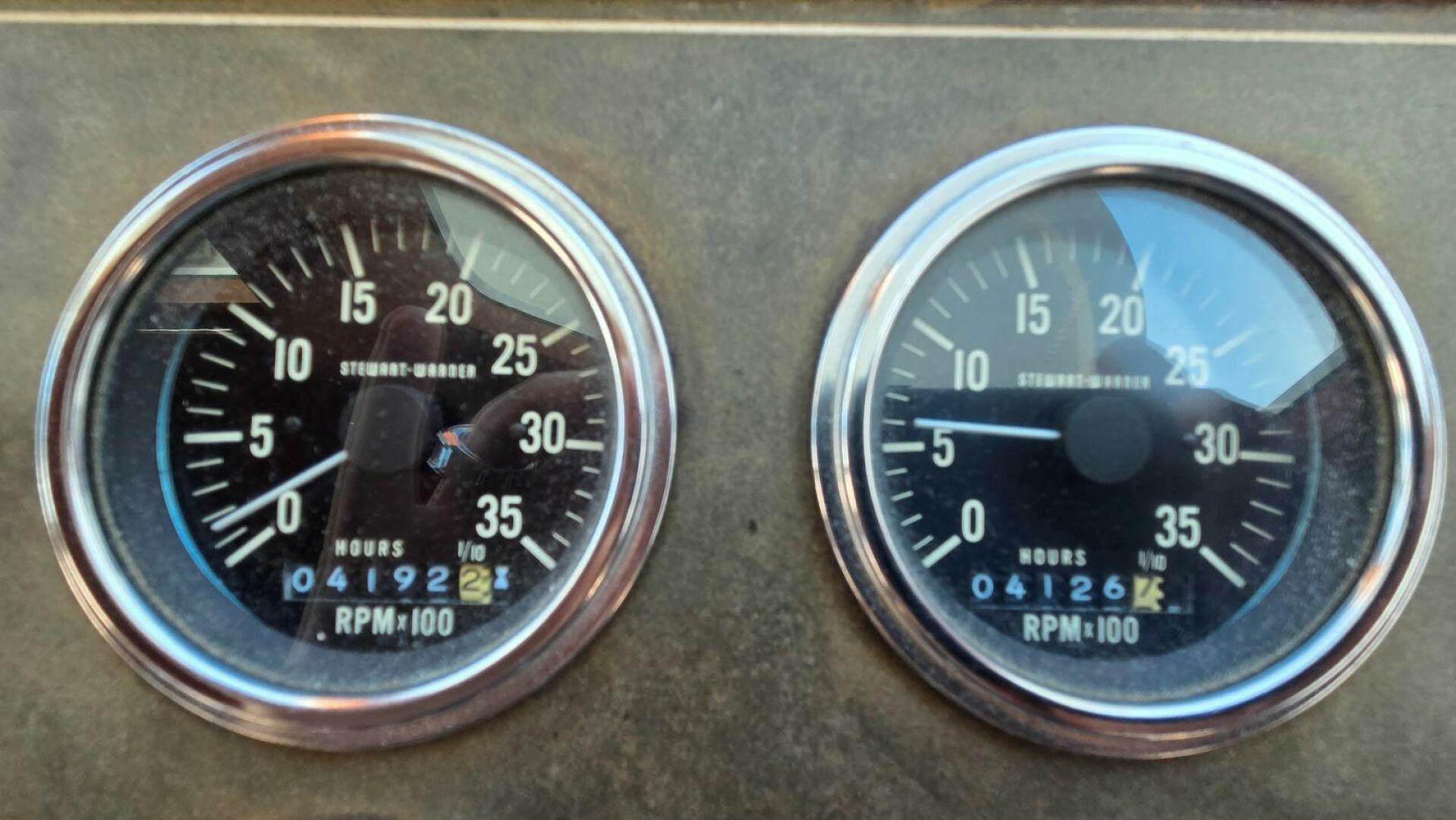 The stand-up engine room is accessed from the mid stateroom and offers excellent access for service and inspection. Power is provided by twin Lehman 135hp diesels with approximately 4,100 hours. Naiad stabilizers were serviced in 2024. Mechanical systems include dual generators, built-in fuel polishing, watermaker, inverter, upgraded charging systems, extensive battery banks, and LED lighting.