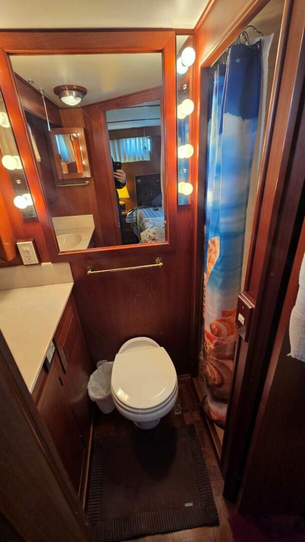 The forward head serves both the forward and mid staterooms and is conveniently located just forward of the main salon. It features a dedicated stall shower, vanity sink, and thoughtful use of space, making it comfortable for guests and practical for extended cruising. Easy access from the main living area also makes this head ideal for day use.