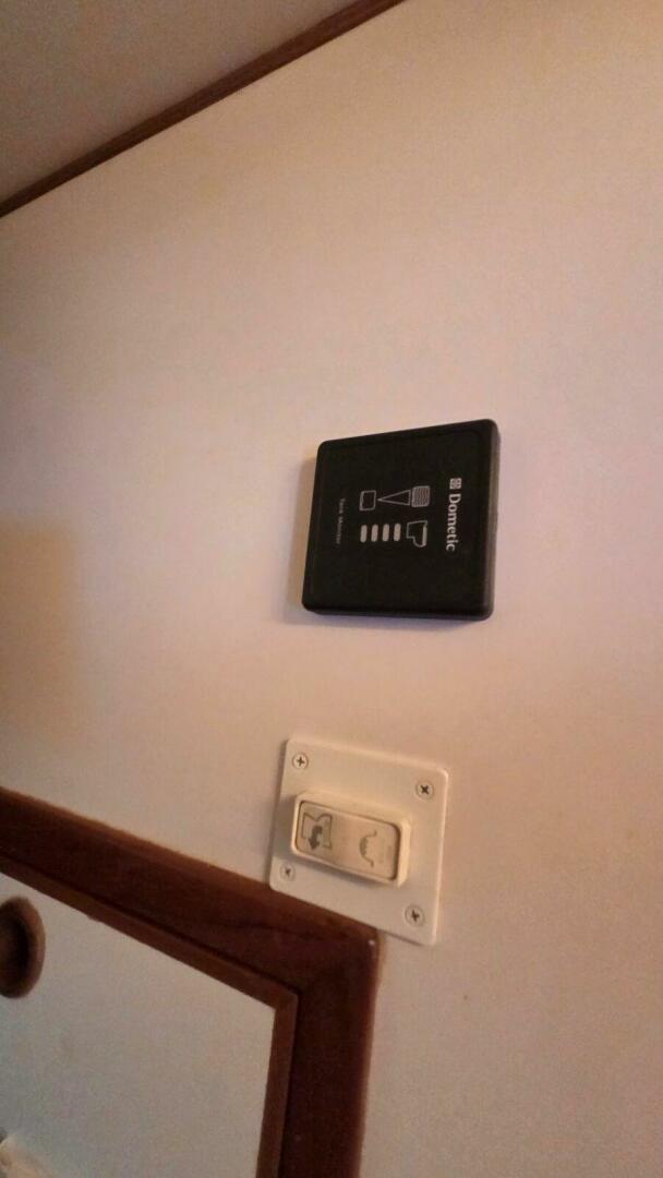 The forward stateroom features twin over/under berths, a cedar-lined hanging locker with storage drawers, and excellent ventilation from four opening ports and an overhead hatch. Headroom is generous at approximately eight feet, giving the space an open feel. A 32” Samsung Smart TV is installed.