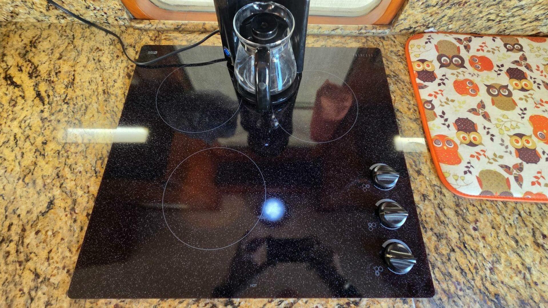 The galley is well designed for cruising and everyday use, featuring granite countertops, a large stainless sink, electric Princess cooktop, Brevel microwave/convection oven, ice maker, Engel refrigerator/freezer under the settee, and an additional upright refrigerator/freezer.