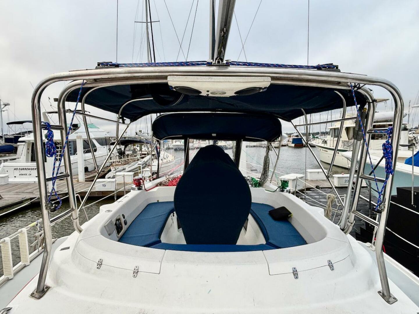 - Custom transom arch with davits for dinghy (lines reach power winch to raise/lower tender)