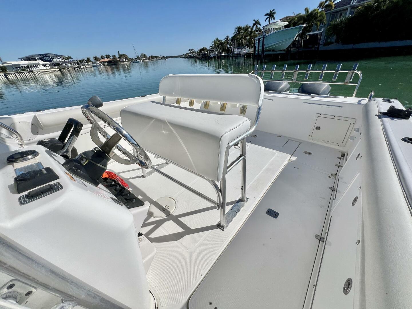 This boat is lift kept, and powered by fuel efficient and reliable Yamaha F250s.