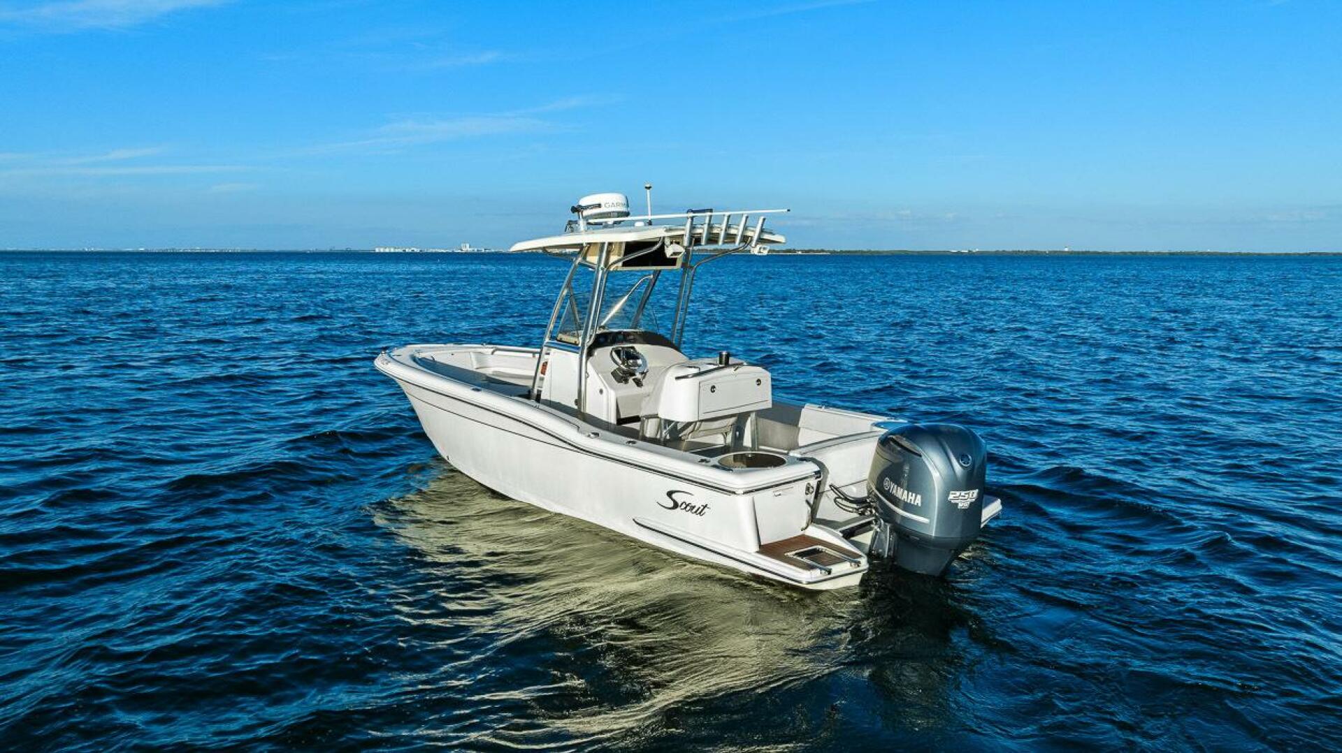 This 2011 Scout 245 XSF was the second forward seating model in the Sportfish line-up. The 245 XSF measures 24’5” long with a wide beam of 8’6”. This Scout is powered by a Yamaha F250 Fourstroke with 338 hours. This center console also contains a 125-gallon fuel tank, which allows anglers to get to the fishing grounds and back with unprecedented range. The technologically-advanced fuel efficient NuV3 hull means tremendous fuel savings, and combined with the bow flare assures a very dry and exceptionally smooth ride when slicing through rough seas. The 245 features insulated port and starboard fish boxes (40 gallons each), an insulated forward cooler (40 quarts) and the forward console seat houses an insulated console cooler (165 quarts). Two bait wells sit port and starboard aft, nine and ten gallons respectively – and there’s even room for a large bucket to fit inside the starboard well. This vessel can be seen at the owners home in St Petersburg by appoint.