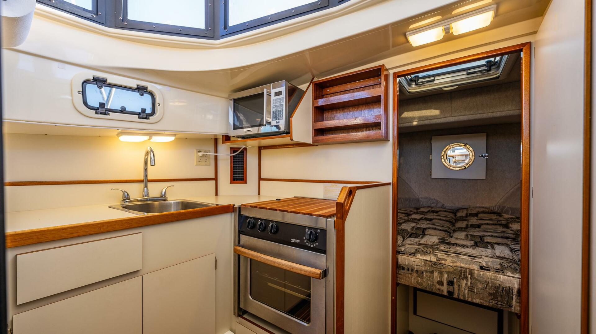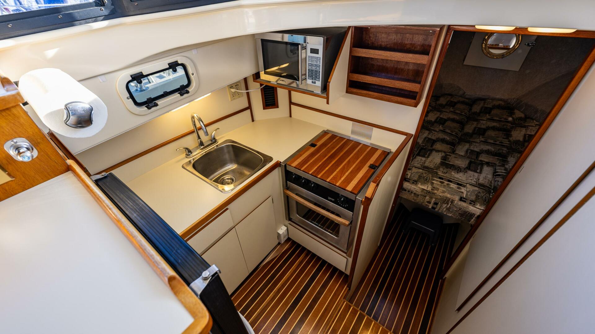 The flybridge + sedan layout, uncommon in this size range, provides excellent visibility underway and a comfortable gathering space at anchor. Inside, the Camano 31 offers bright sightlines, practical storage, and a layout that feels surprisingly spacious for a 31‑footer. Owners also benefit from a strong and active community, along with solid parts support that continues to make ownership straightforward.